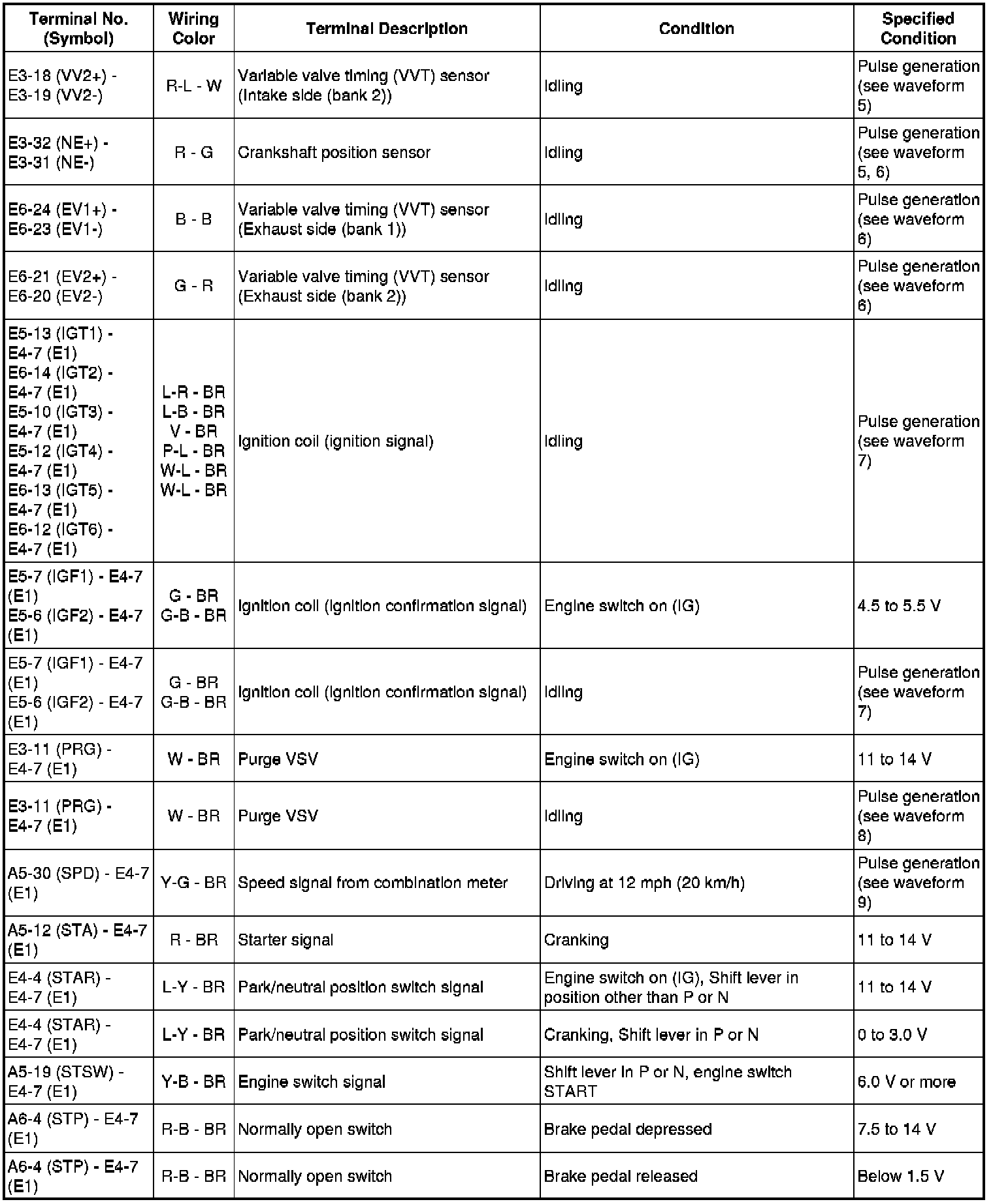 The standard normal voltage between each pair of the ECM terminals is shown in the table below. The appropriate conditions for checking each pair of the terminals are also indicated. The result of checks should be compared with the standard normal voltage for that pair of terminals, displayed in the Specified Condition column. The illustration above can be used as a reference to identify the ECM terminal locations.