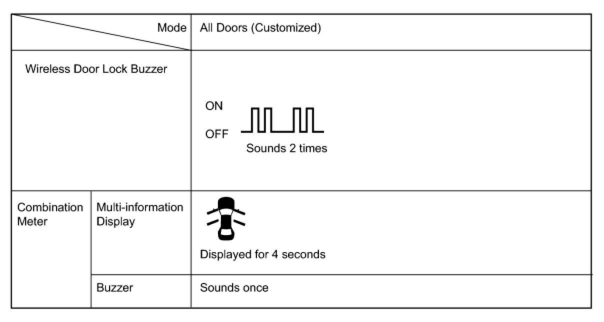 (c) The certification ECU sounds the wireless door lock buzzer and combination meter buzzer to inform the user that the mode has been switched.