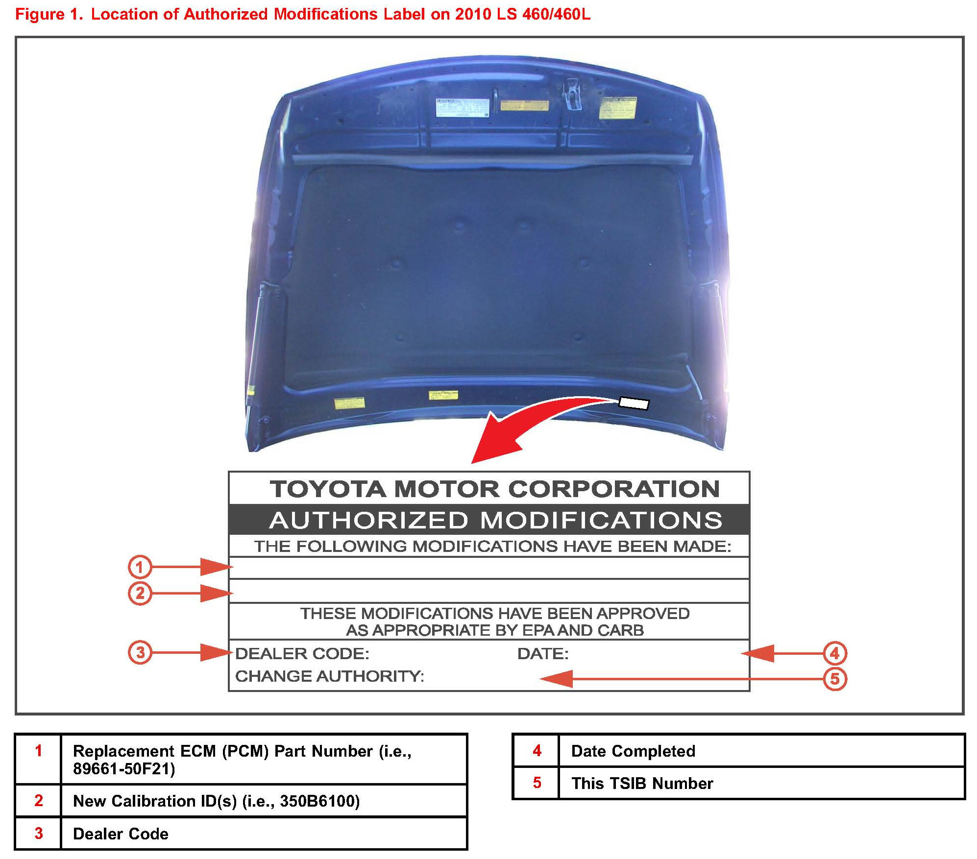 2. Check for the Authorized Modifications Label affixed to the vehicle in the location shown in Figure 1. Confirm if the ECM (PCM) calibration has been updated. If the calibration ID listed is NOT the latest ECM (PCM) calibration - go to step 3.