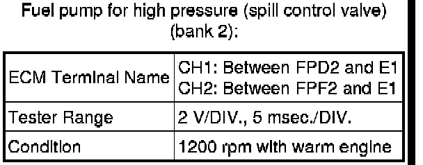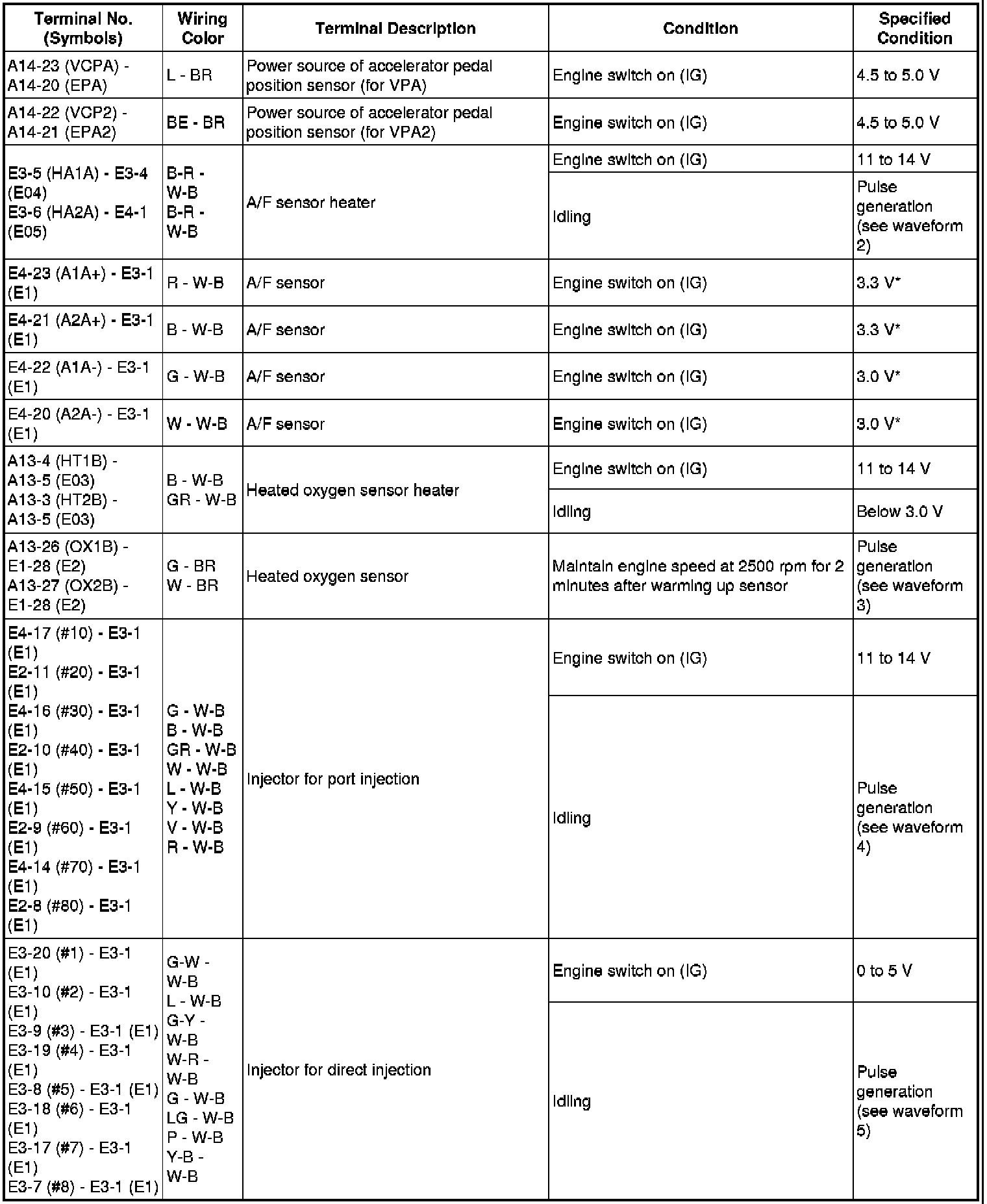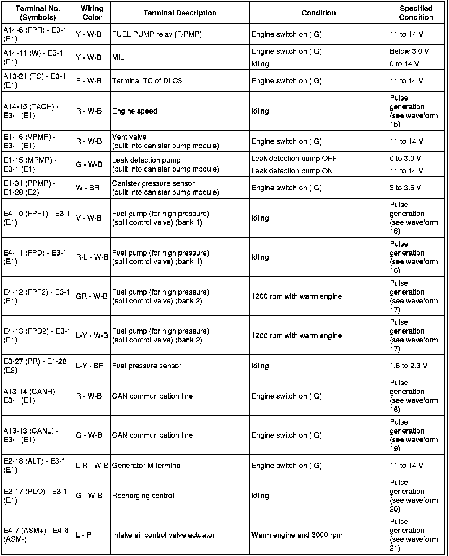 The standard normal voltage between each pair of the ECM terminals is shown in the table below. The appropriate conditions for checking each pair of the terminals are also indicated. The result of checks should be compared with the standard normal voltage for that pair of terminals, displayed in the Specified Condition column. The illustration above can be used as a reference to identify the ECM terminal locations.