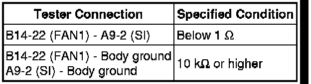 (c) Check the resistance of the wire harness between the front controller B14-22 (FAN1) and cooling fan ECU A9-2 (SI).