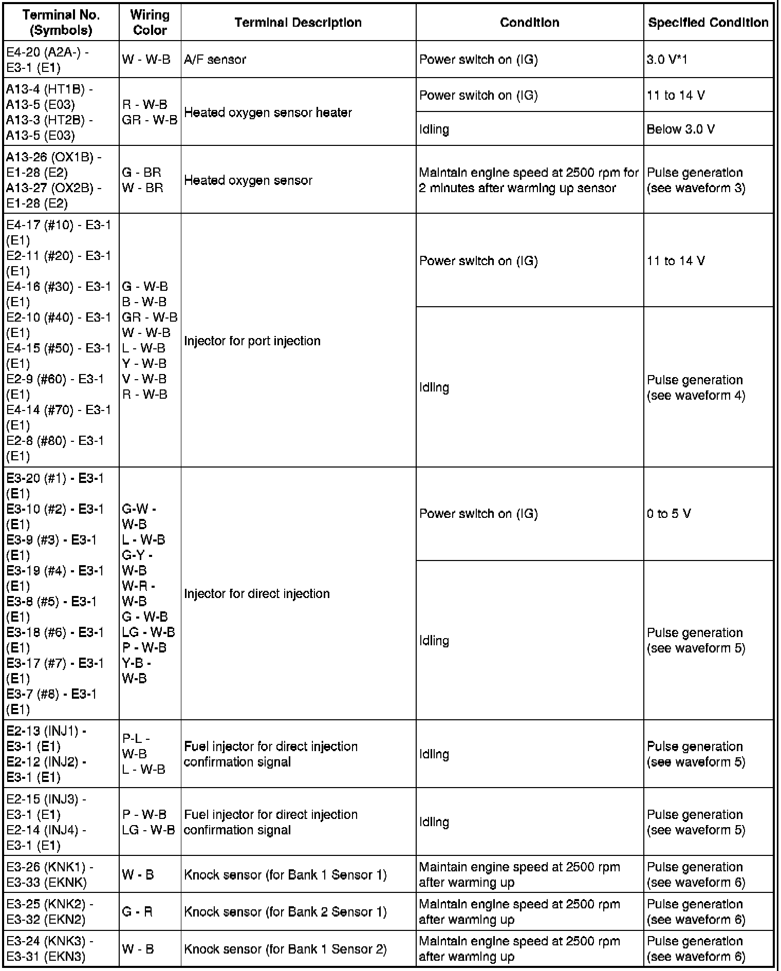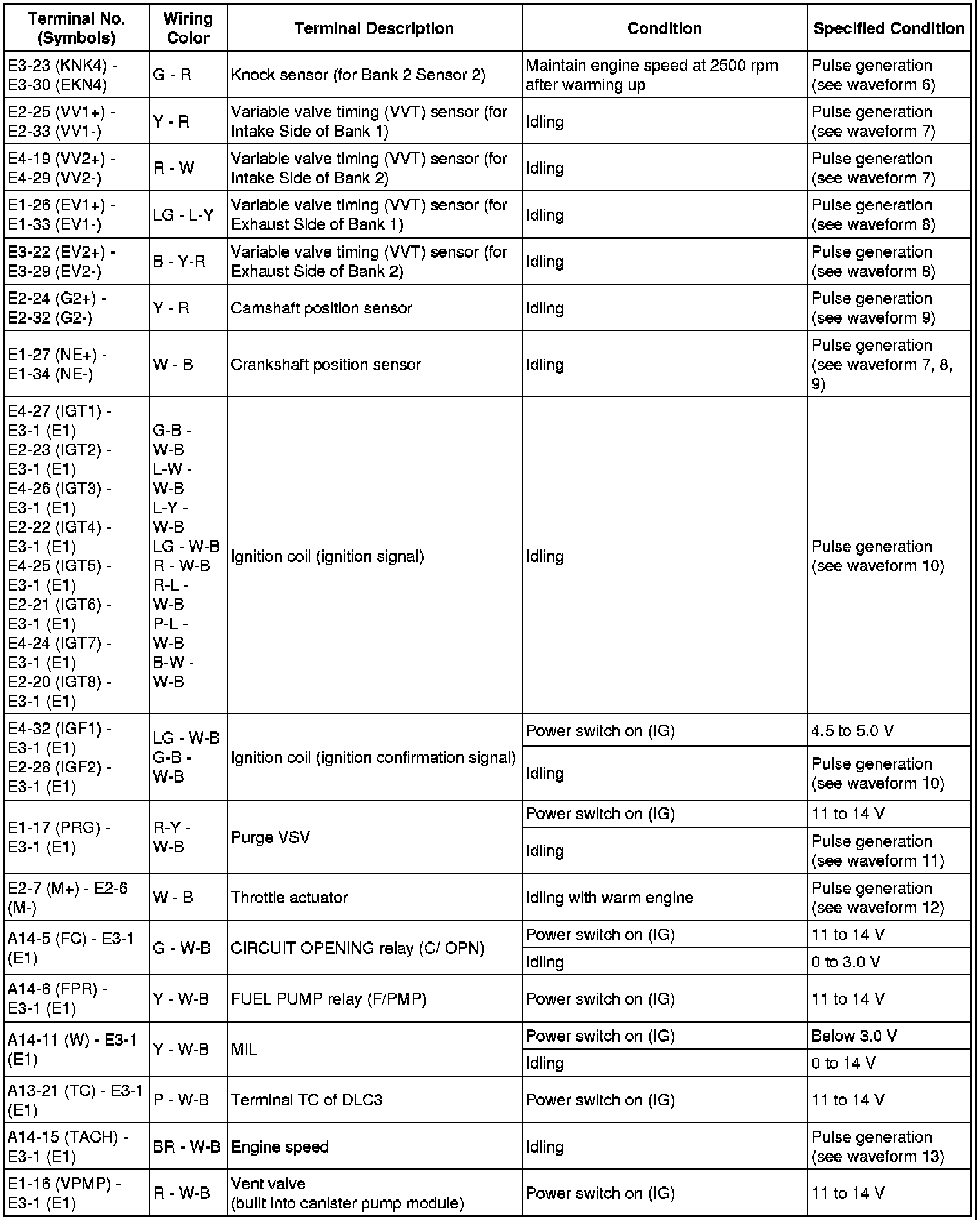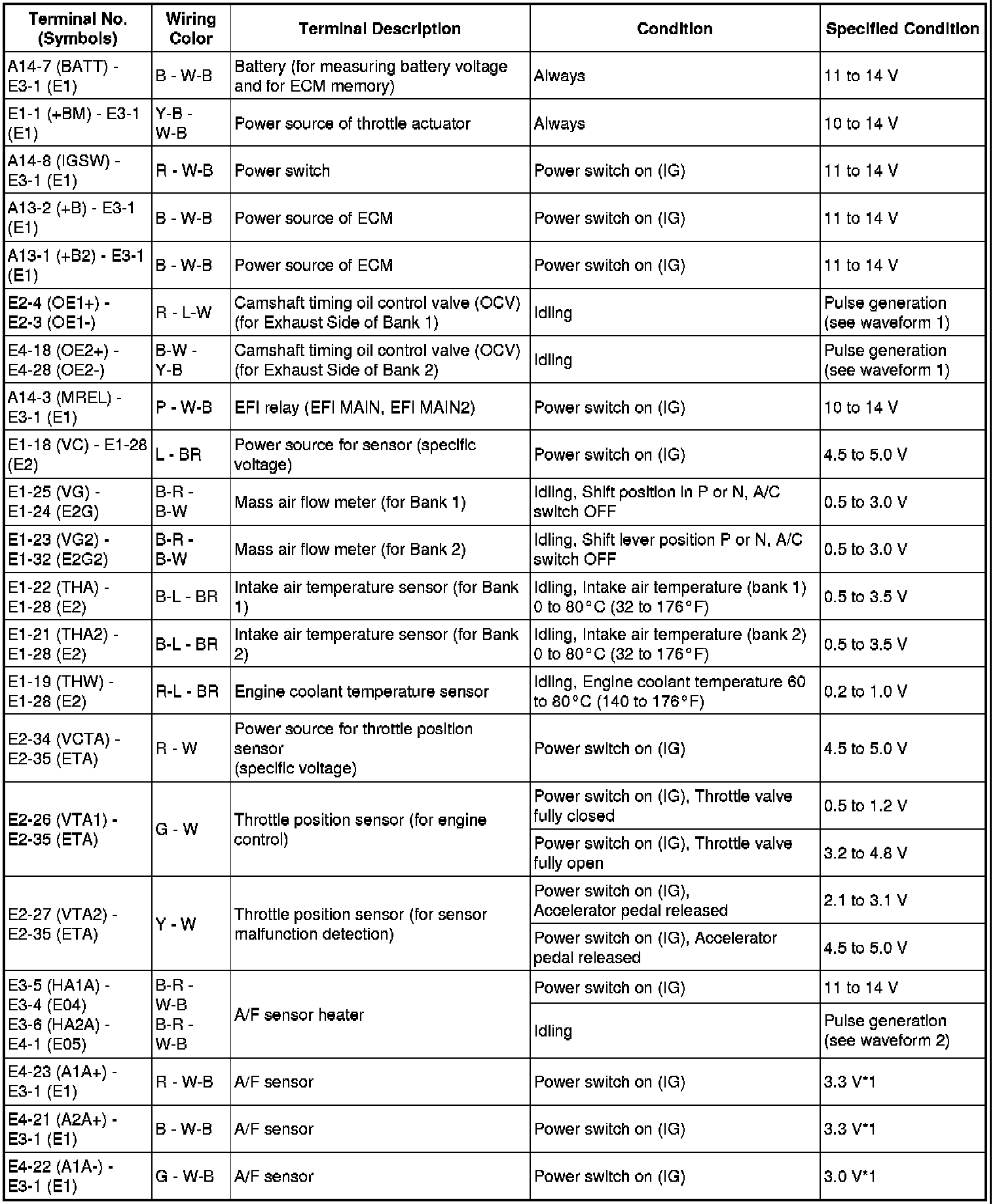 The standard normal voltage between each pair of the ECM terminals is shown in the table below. The appropriate conditions for checking each pair of the terminals are also indicated. The result of checks should be compared with the standard normal voltage for that pair of terminals, displayed in the Specified Condition column. The illustration above can be used as a reference to identify the ECM terminal locations.