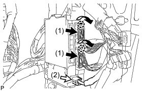 (d) Raise the multiplex network body ECU as shown by arrow (1), and then pull it out as shown by arrow (2) in the illustration.