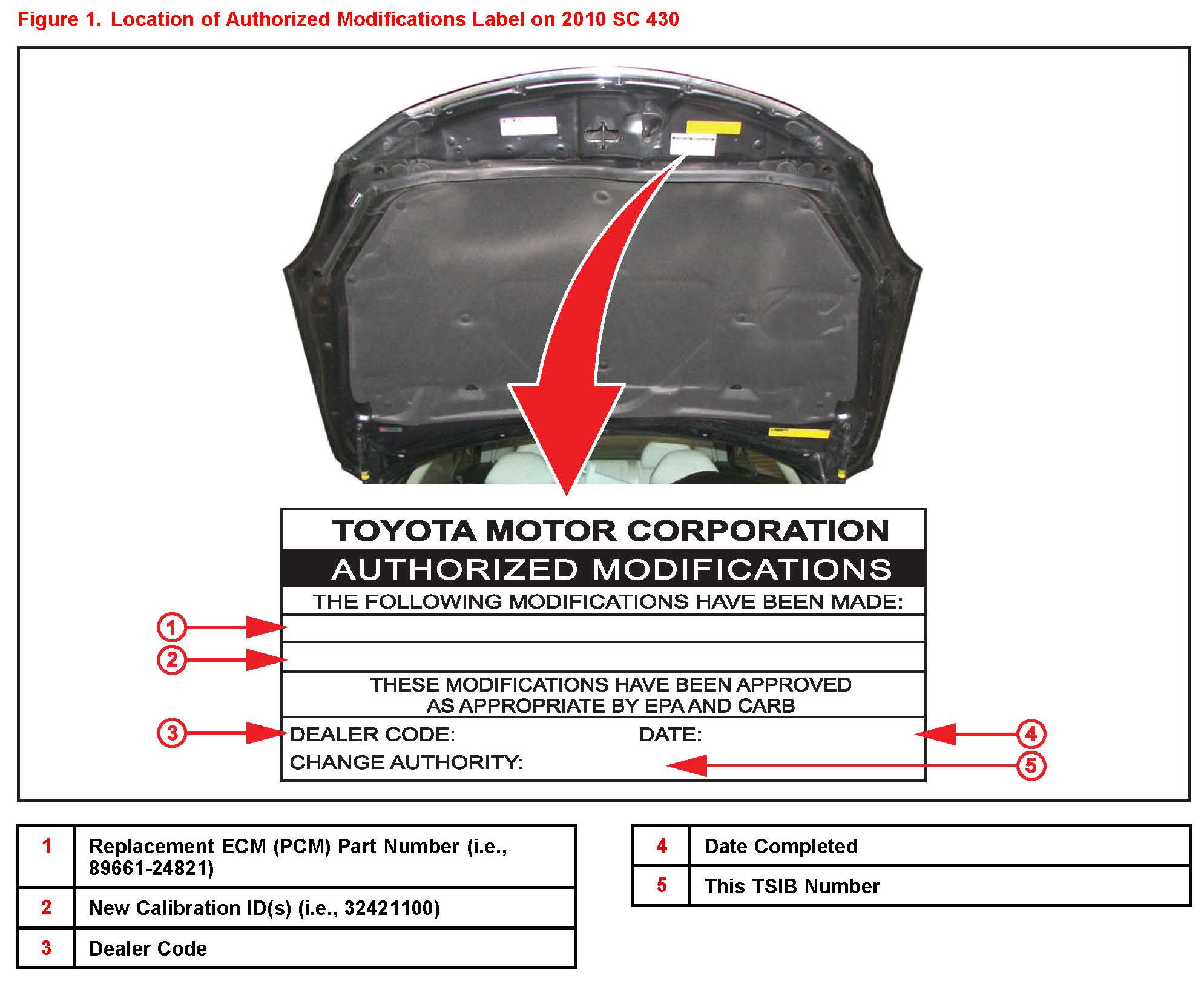 2. Check for the Authorized Modifications Label affixed to the vehicle in the location shown in Figure 1. Confirm if the ECM (PCM) calibration has been updated. If the calibration ID listed is NOT the latest ECM (PCM) calibration - go to step 3.