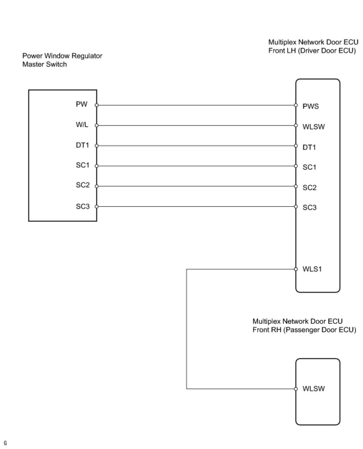When the ignition switch is ON and the window lock switch is set to UNLOCK, the power window regulator master switch sends remote signals to the multiplex network door ECU front LH (driver door ECU), and the remote signals are then passed to the multiplex network door ECU front RH (passenger door ECU). The multiplex network door ECU front RH then activates the appropriate power window regulator motor.