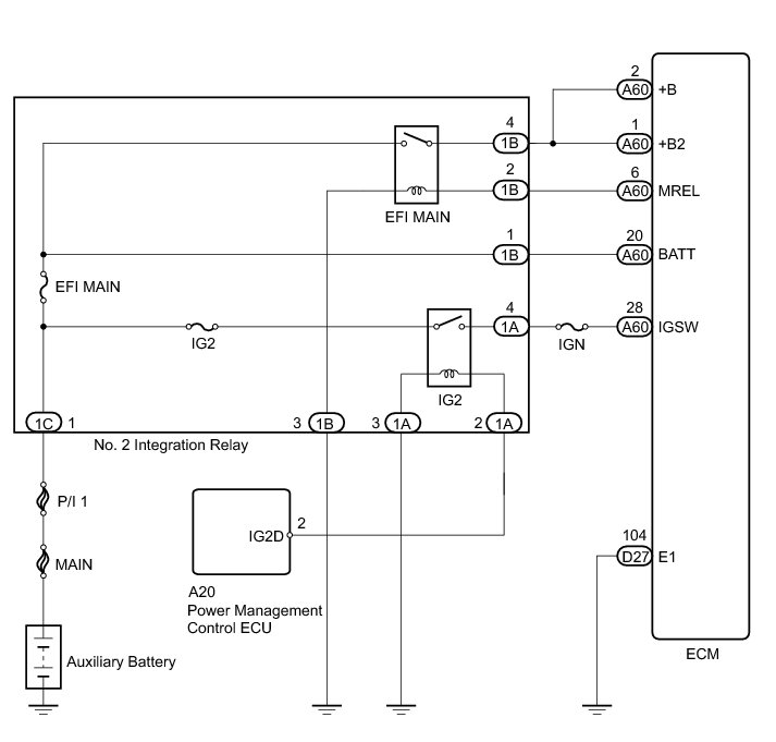 When the power switch is turned on (IG), auxiliary battery voltage is applied to IGSW of the ECM. The output signal from the MREL terminal of the ECM causes a current to flow to the coil, closing the contacts of the No. 2 integration relay (EFI MAIN relay) and supplying power to either terminal +B and +B2 of the ECM.