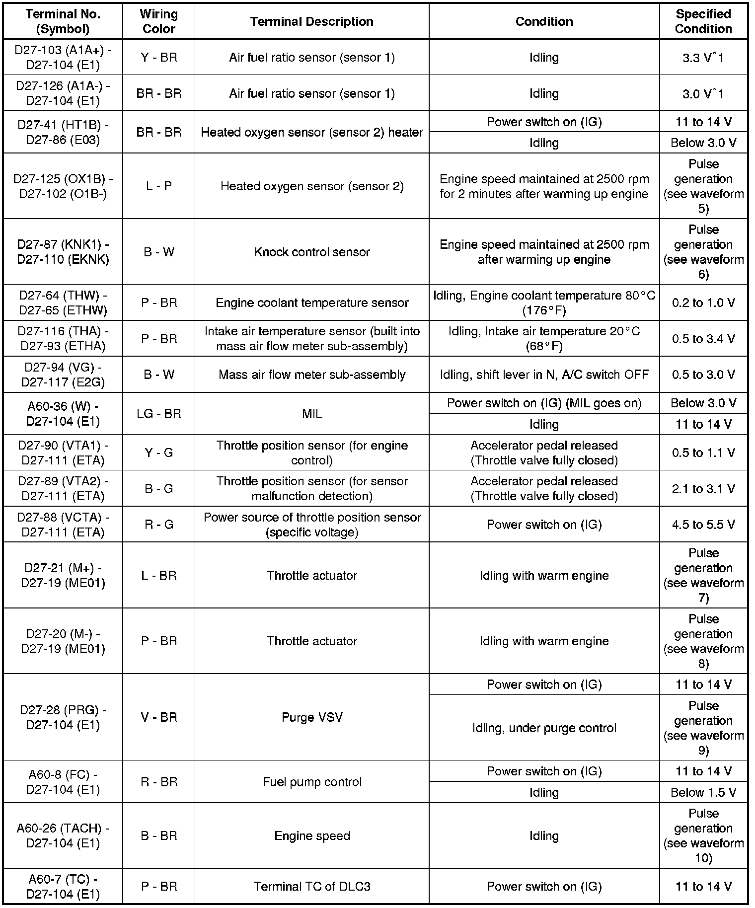 The standard normal voltage between each pair of the ECM terminals is shown in the table below. The appropriate conditions for checking each pair of the terminals are also indicated. The result of checks should be compared with the standard normal voltage for that pair of the terminals, and displayed in the "Specified Condition" column. The illustration above can be used as a reference to identify the ECM terminal locations.
