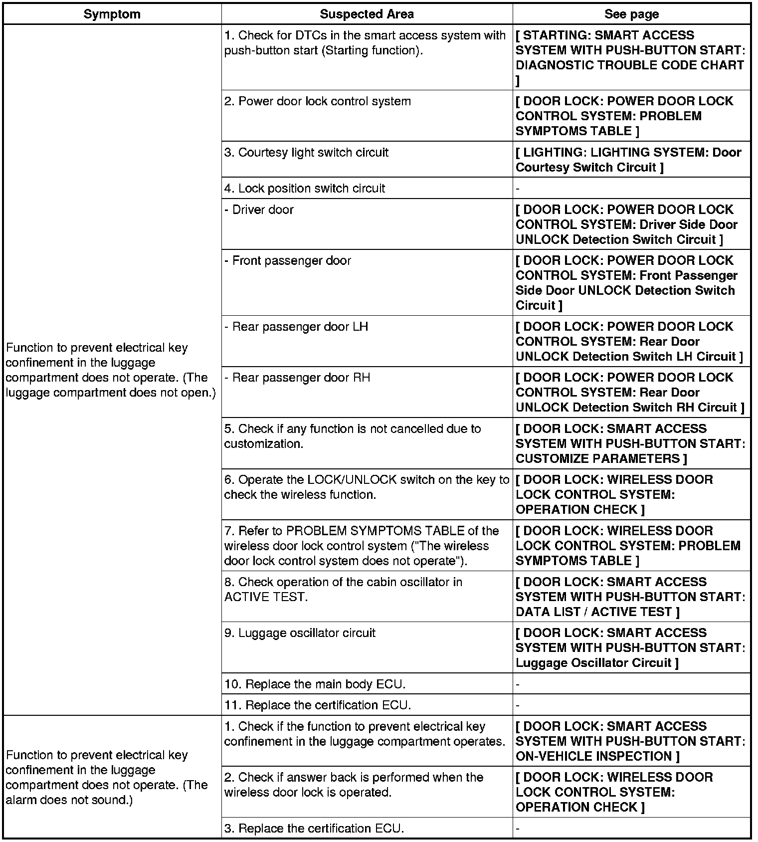 DOOR LOCK: SMART ACCESS SYSTEM WITH PUSH-BUTTON START: PROBLEM SYMPTOMS TABLE