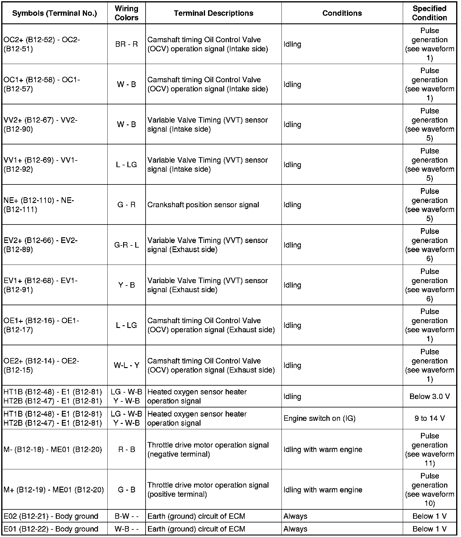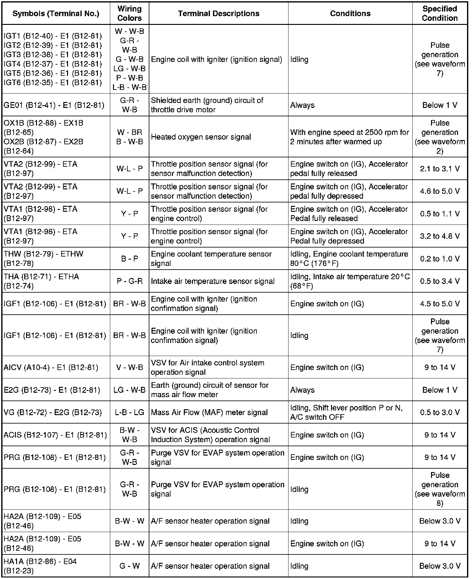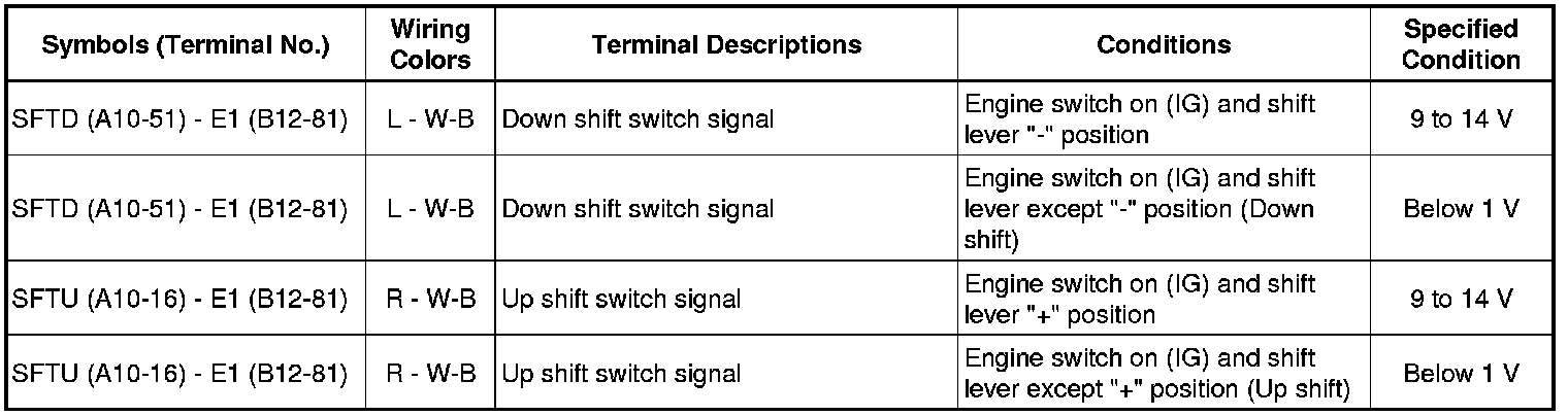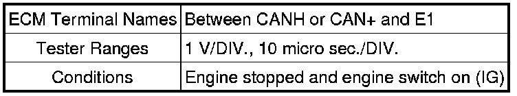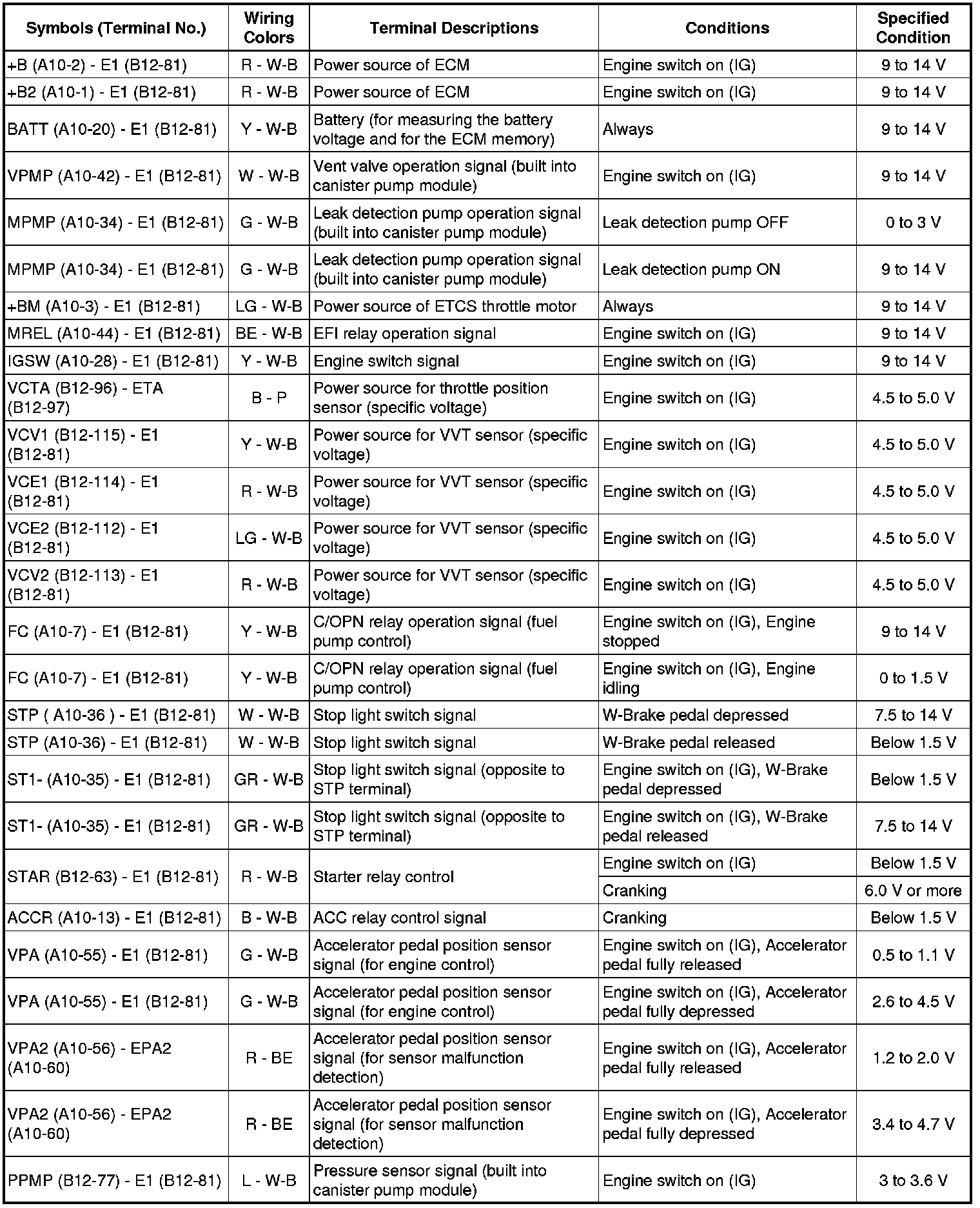 The standard normal voltage between each pair of the ECM terminals is shown in the table below. The appropriate conditions for checking each pair of the terminals are also indicated.