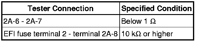 (2) Connect the battery's positive (+) lead to terminal 2A-6 and negative (-) lead to terminal 2A-7. Measure the resistance between EFI fuse terminal 2 and terminal 2A-8 when battery voltage is applied between the terminals.