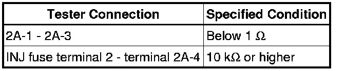 (2) Connect the battery's positive (+) lead to terminal 2A-1 and negative (-) lead to terminal 2A-3. Measure the resistance between the INJ fuse terminals 2 and terminal 2A-4 when battery voltage is applied between the terminals.