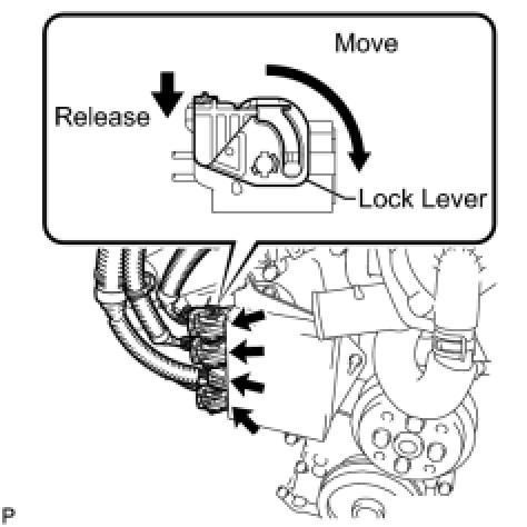 (1) Move the lock lever in the direction indicated by the arrow to release the connector lock. Disconnect the 3 connectors with wire harness locks and the connector from the injector driver.