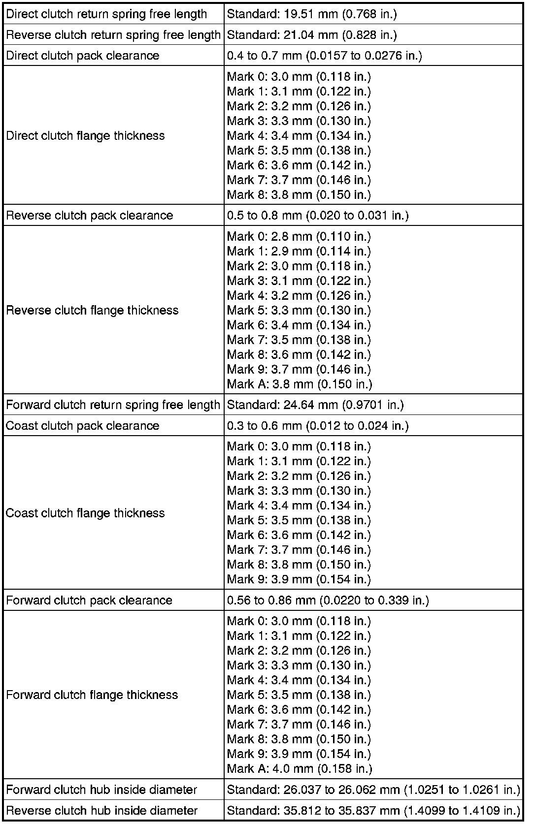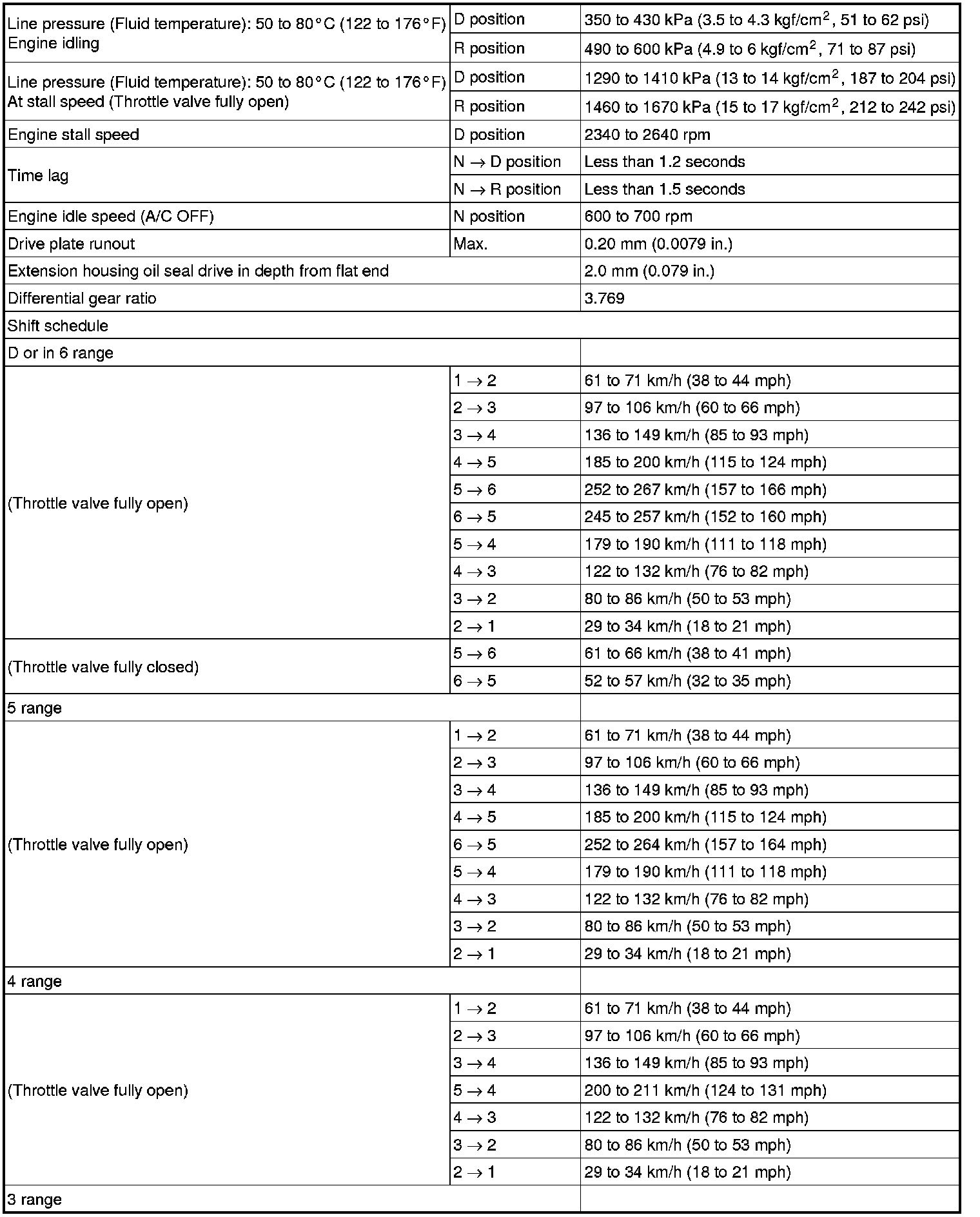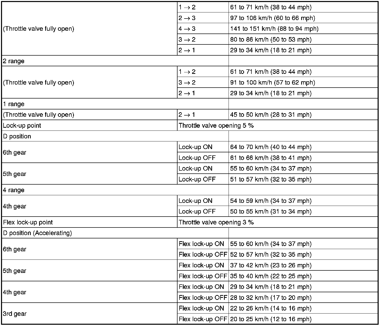 * All shift point values indicated in the above table are actual values. Therefore, if checking a shift point with a chassis dynamometer, keep in mind that there is a range of error in the chassis dynamometer indication.
