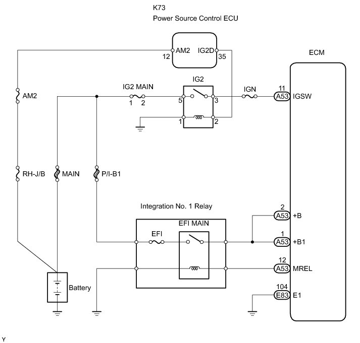 When the power switch is turned on (IG), the battery voltage is applied to the IGSW of the ECM. The output signal from the MREL terminal of the ECM causes a current to flow to the coil, closing the contacts of the integration relay (EFI MAIN relay) and supplying power to either terminal +B or +B1 of the ECM.
