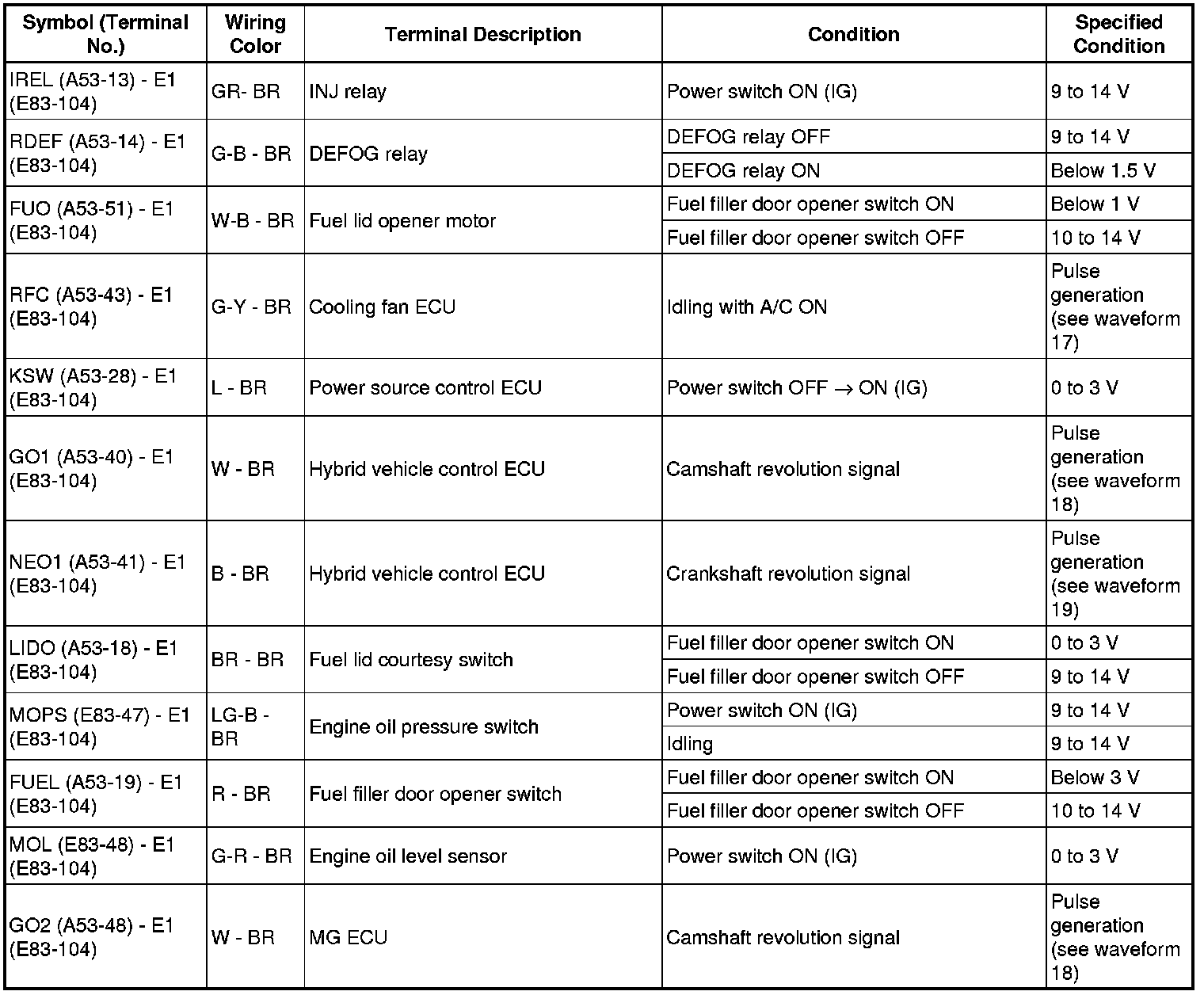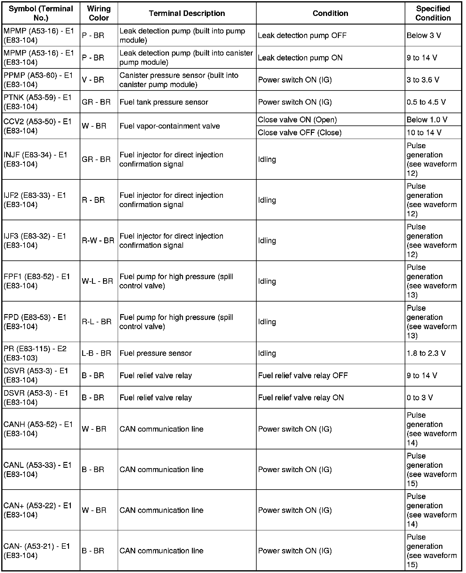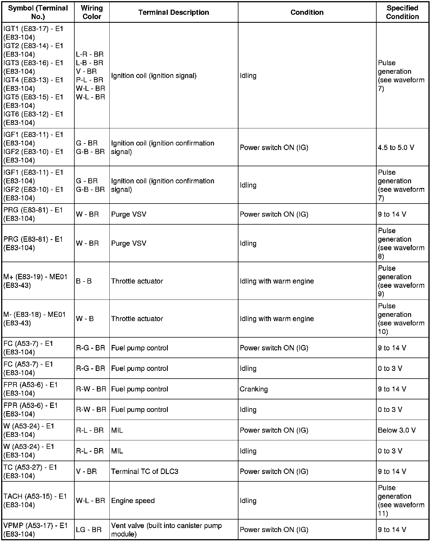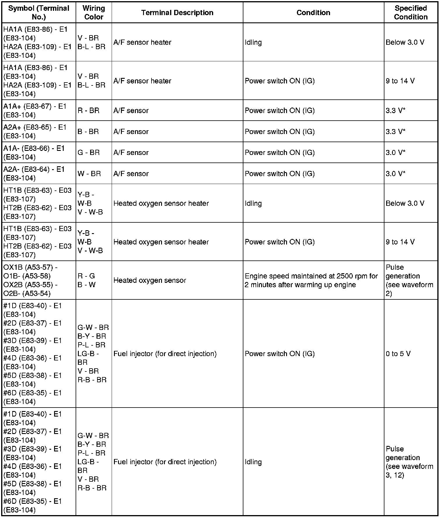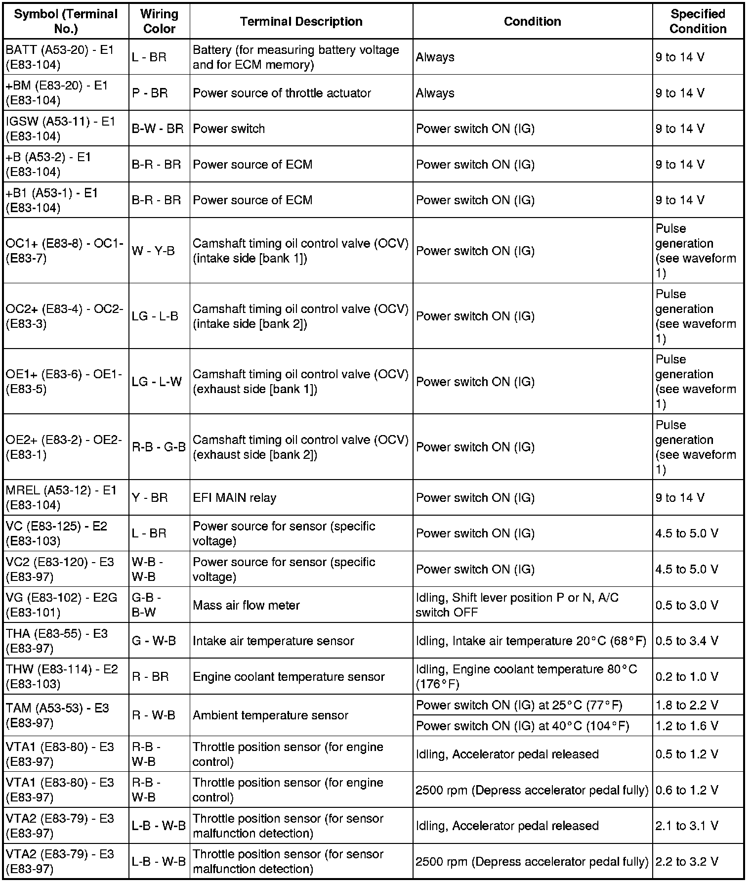 * The standard normal voltage (reference values) between each pair of the ECM terminals is shown in the table below. The appropriate conditions for checking each pair of the terminals are also indicated. The result of checks should be compared with the standard normal voltage for that pair of terminals, displayed in the Specified Condition column. The illustration above can be used as a reference to identify the ECM terminal locations.