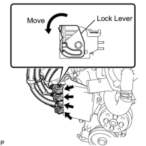 (1) Connect the 3 connectors with wire harness locks and the connector to the injector driver. Move the lock lever in the direction indicated by the arrow to lock the connector.
