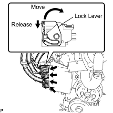 (1) Move the lock lever in the direction indicated by the arrow to release the connector lock. Disconnect the 3 connectors with wire harness locks and the connector from the injector driver.
