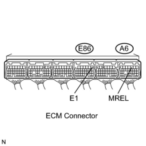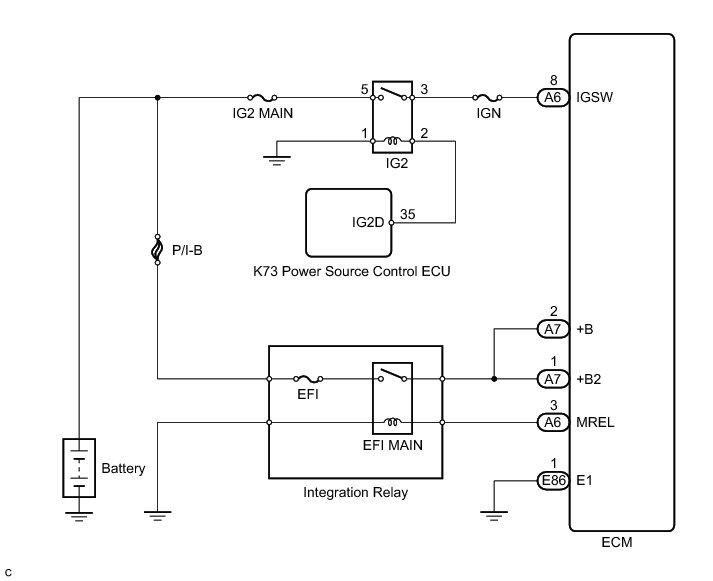 When the engine switch is turned on (IG), voltage from the ECM's MREL terminal is applied to the EFI MAIN relay. This causes the contacts of the EFI MAIN relay to close, which supplies power to terminals +B and +B2 of the ECM.