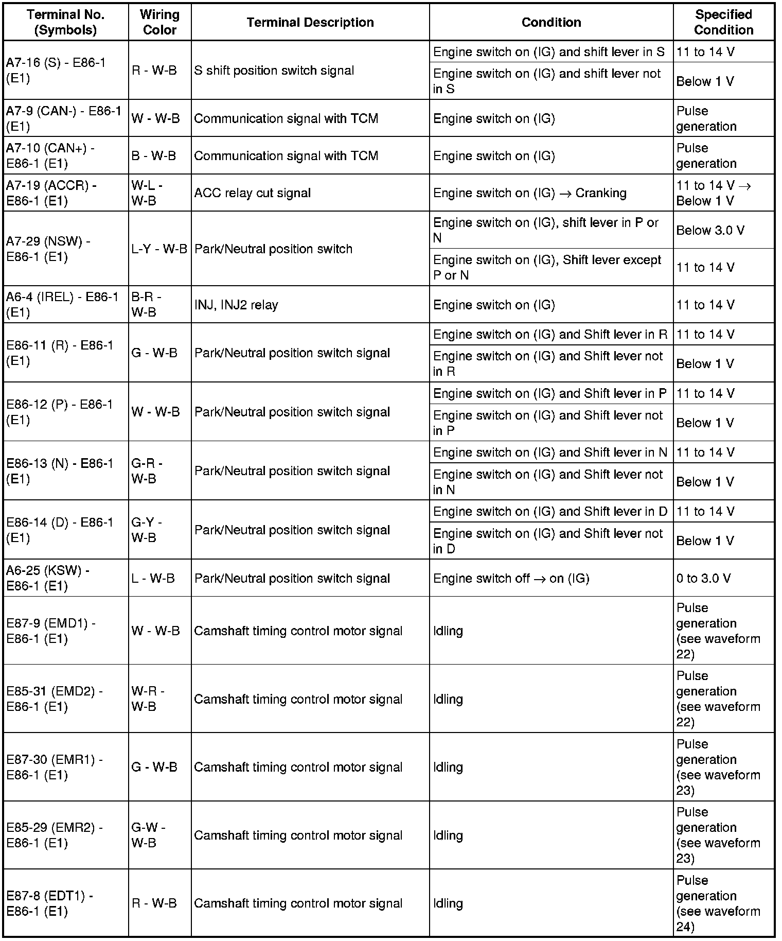 The standard normal voltage between each pair of the ECM terminals is shown in the table below. The appropriate conditions for checking each pair of the terminals are also indicated. The result of checks should be compared with the standard normal voltage for that pair of terminals, displayed in the Specified Condition column. The illustration above can be used as a reference to identify the ECM terminal locations.