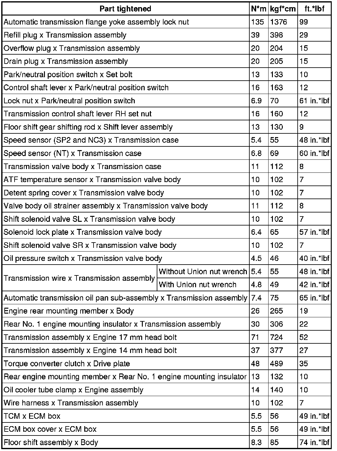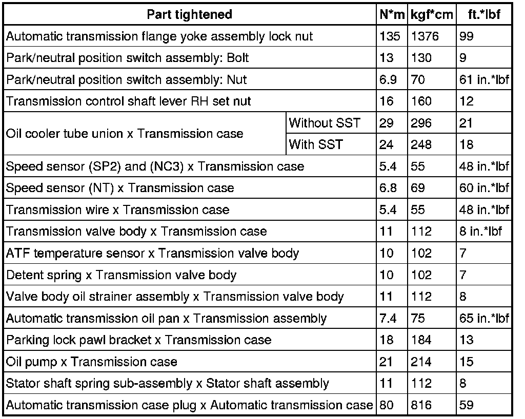 SERVICE SPECIFICATIONS: AA80E AUTOMATIC TRANSMISSION: TORQUE SPECIFICATIONS