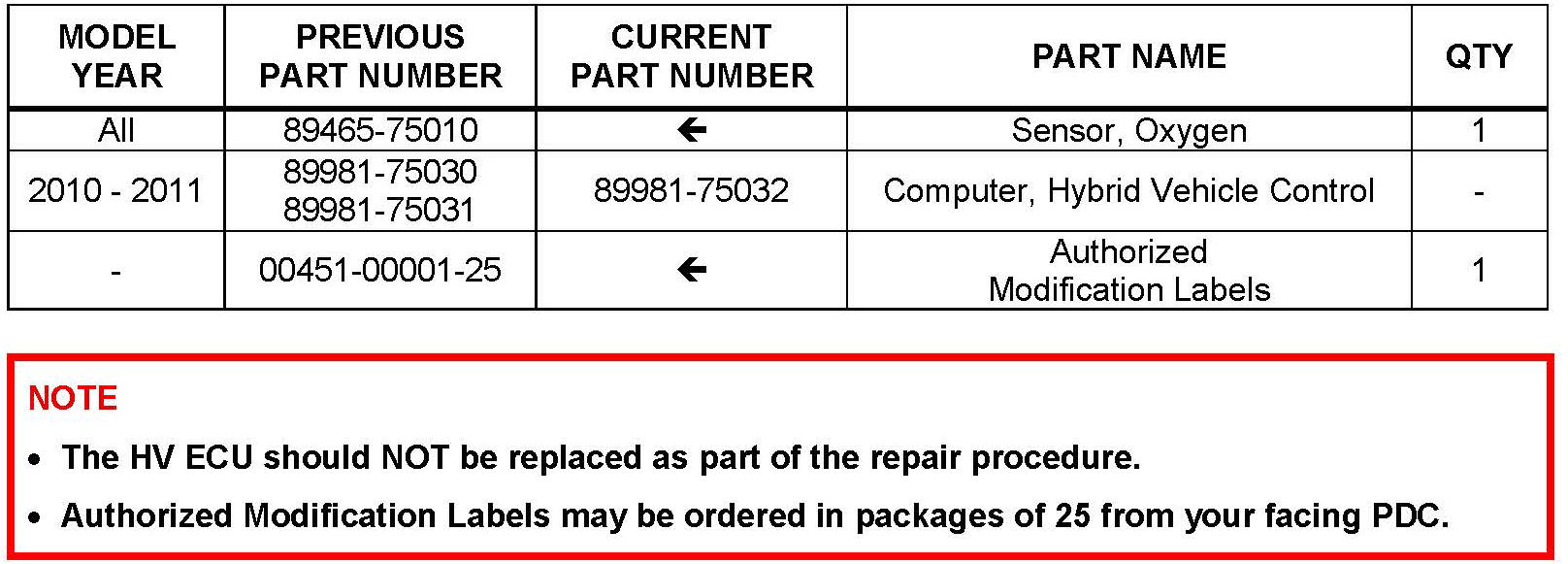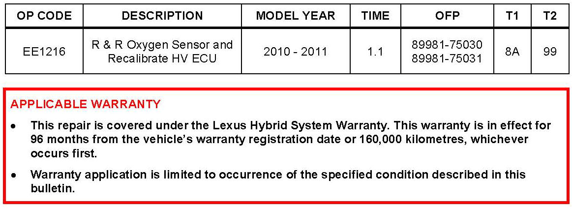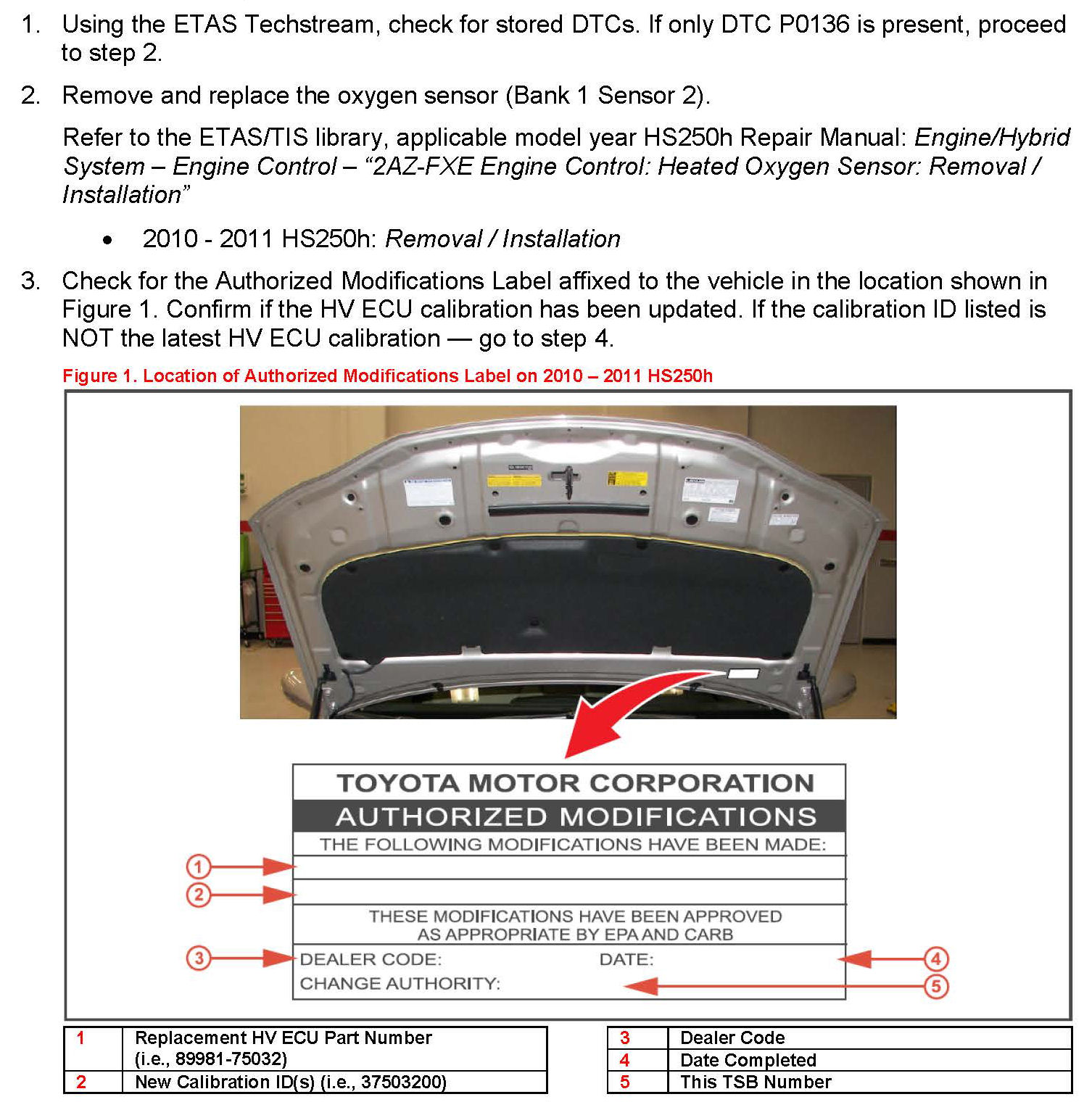 Some 2010 - 2011 model year HS250 vehicles equipped with a 2AZ-FXE engine may exhibit a MIL "ON" condition with Diagnostic Trouble Code (DTC) P0136 Oxygen Sensor Circuit Malfunction (Bank 1 Sensor 2). The oxygen sensor and Hybrid Vehicle ECU (HV ECU) logic have been modified to reduce the possibility of this condition occurring. Use the following repair procedure to address this condition.