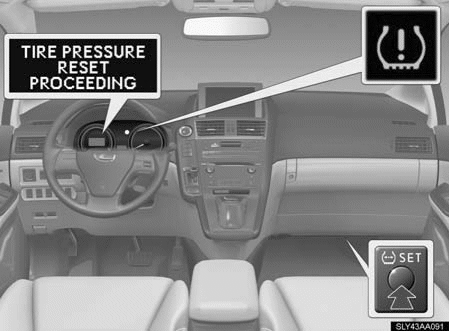 - Press and hold the tire pressure warning reset switch for 3 seconds or more so that the tire pressure warning light blinks 3 times and the message "TIRE PRESSURE RESET PROCEEDING" appears on the multi-information display. See Fig 1.