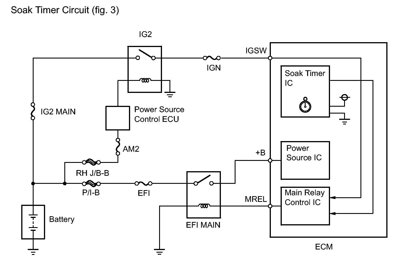 TEXT IN ILLUSTRATION*1 EVAP Purge Flow *2 to Intake Manifold *3 ECM *4 Soak Timer *5 Purge VSV (on) *6 Fuel Cap *7 Canister Filter *8 Fuel Tank *9 Leak Detection Pump (off) *10 Canister Pressure Sensor *11 Reference Orifice (0.02 inches) *12 Refueling Valve *13 to Atmosphere *14 Vent Valve (off) *15 Canister Pump Module *16 Canister Component Operation Canister Contains activated charcoal to absorb EVAP (Evaporative Emissions) generated in fuel tank. Cut-off valve Located in fuel tank. Valve floats and closes when fuel tank is 100% full. Purge VSV (Vacuum Switching Valve) Opens or closes line between canister and intake manifold. ECM uses purge VSV to control EVAP purge flow. In order to discharge EVAP absorbed by canister to intake manifold, ECM opens purge VSV. EVAP discharge volume to intake manifold is controlled by purge VSV duty cycle (current-carrying time) (Open: on; Closed: off). Refueling valve Controls EVAP pressure from fuel tank to canister. Valve consists of diaphragm, spring and restrictor (diameter: 0.08 inches). When fuel vapor and pressure inside fuel tank increase, valve opens. While EVAP purged, valve closes and restrictor prevents large amount of vacuum from affecting pressure in fuel tank. Valve opens while refueling. Roll-over valve Located in fuel tank. Valve closes by its own weight when vehicle overturns to prevent fuel from spilling out. Soak timer Built into ECM. To ensure accurate EVAP monitor, measures 5 hours (+/- 15 min) after engine switch is turned off. This allows fuel to cool down, stabilizing EVAP pressure. When approximately 5 hours elapsed, ECM activates (refer to Fig 6fig. 3). Canister pump module Consists of (a) to (d) below. Canister pump module cannot be disassembled. (a) Vent valve Vents and closes EVAP system. When ECM turns valve on, EVAP system is closed. When ECM turns valve off, EVAP system is vented. Negative pressure (vacuum) is created in EVAP system to check for EVAP leaks by closing purge VSV, turning on vent valve (closing it) and operating leak detection pump (refer to fig. 1Fig 3). (b) Canister pressure sensor Indicates pressure as voltage. ECM supplies regulated 5 V to canister pressure sensor, and uses feedback from sensor to monitor EVAP system pressure (refer Fig 5to fig. 2). (c) Leak detection pump Creates negative pressure (vacuum) in EVAP system for leak check. (d) Reference orifice Has opening with 0.02 inch diameter. Vacuum is produced through orifice by closing purge VSV, turning off vent valve and operating leak detection pump to monitor reference pressure. Reference pressure indicates small leak of EVAP. TEXT IN ILLUSTRATION*1 Canister Pump Module (fig. 1) *2 Airflow *3 Condition: Purge Flow *4 Condition: Leak Check *5 Vent Valve: off (vent) *6 to Canister Filter (Atmosphere) *7 Canister *8 Reference Orifice (0.02 inch) *9 from Refueling Valve *10 Canister Pressure Sensor *11 Leak Detection Pump: off *12 Vent Valve: on (closed) *13 Leak Detection Pump: on - - Courtesy of © TOYOTA, LICENSE AGREEMENT TMS1002
