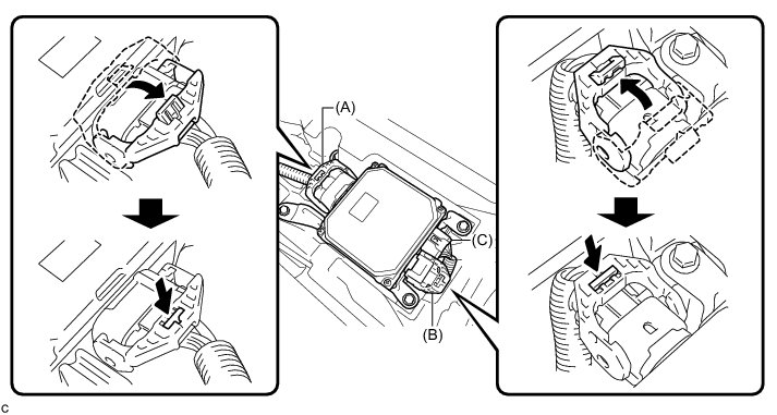 (b) Connect the connectors (A), (B) and (C) to the power steering ECU assembly.