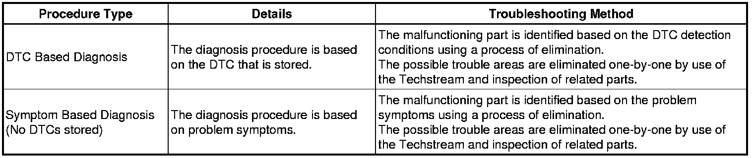 The troubleshooting procedures consist of diagnosis procedures for when a DTC is stored and diagnosis procedures for when no DTC is stored. The basic idea is explained in the following table.