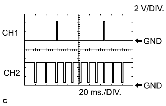 Between KNK2 and EKN2Tester Range 1 V/DIV., 1 ms./DIV. Condition Engine speed maintained at 4000 rpm after warning up engine HINT: