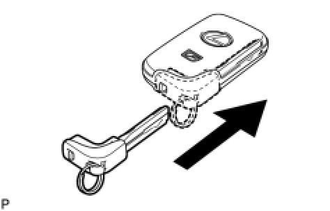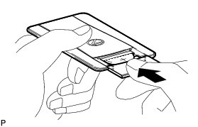 (a) Push in and install the transmitter battery (lithium battery) while being careful of the following: 1) the orientation of the battery positive (+) and negative (- ) terminals; and 2) being sure to insert the battery between the 2 terminals and deep into the card, in the direction shown by the arrow in the illustration.