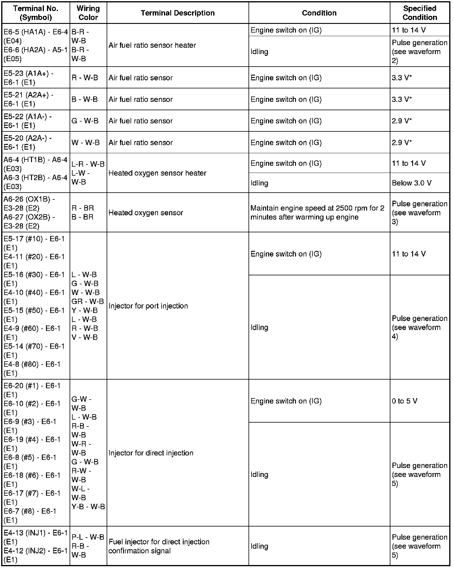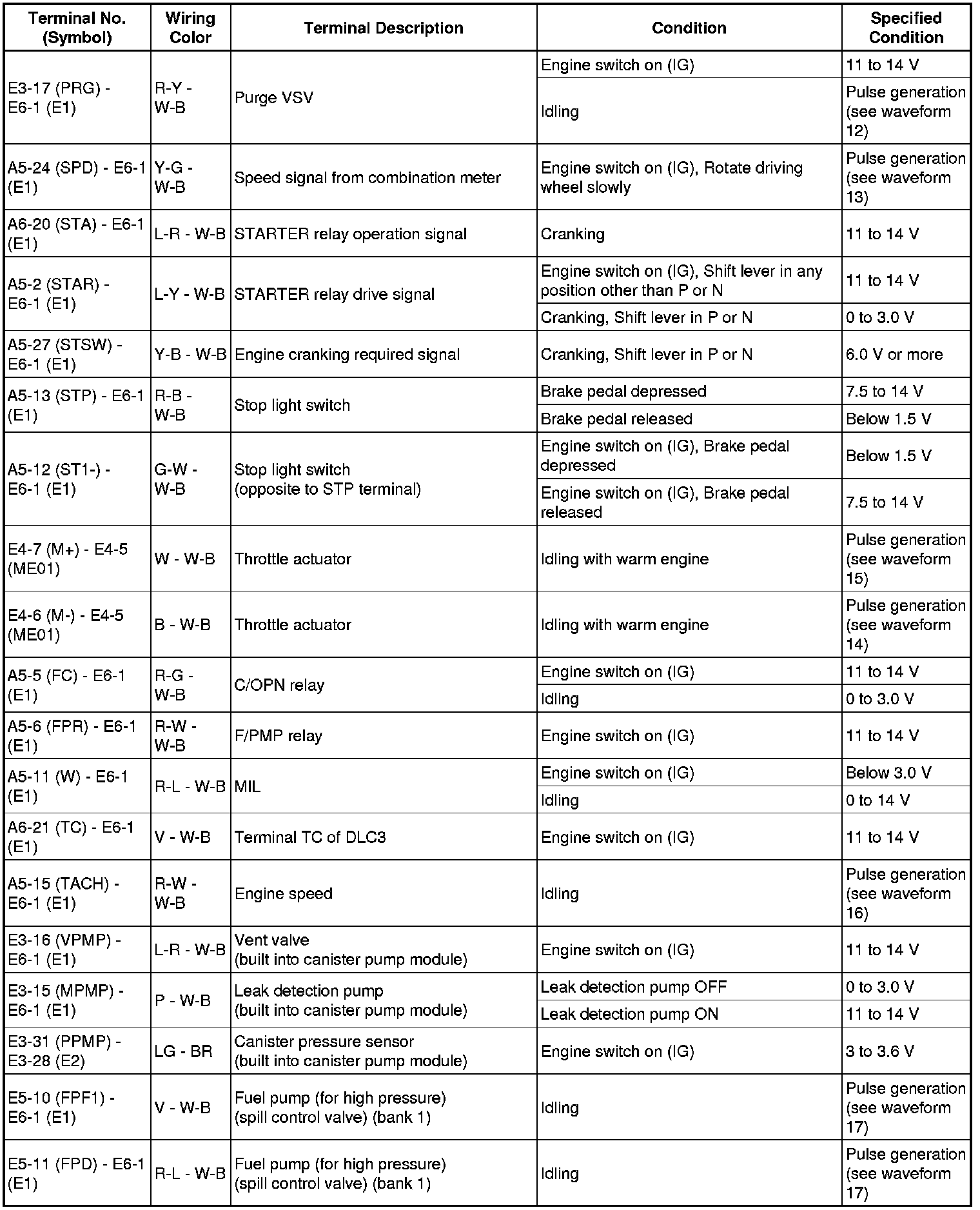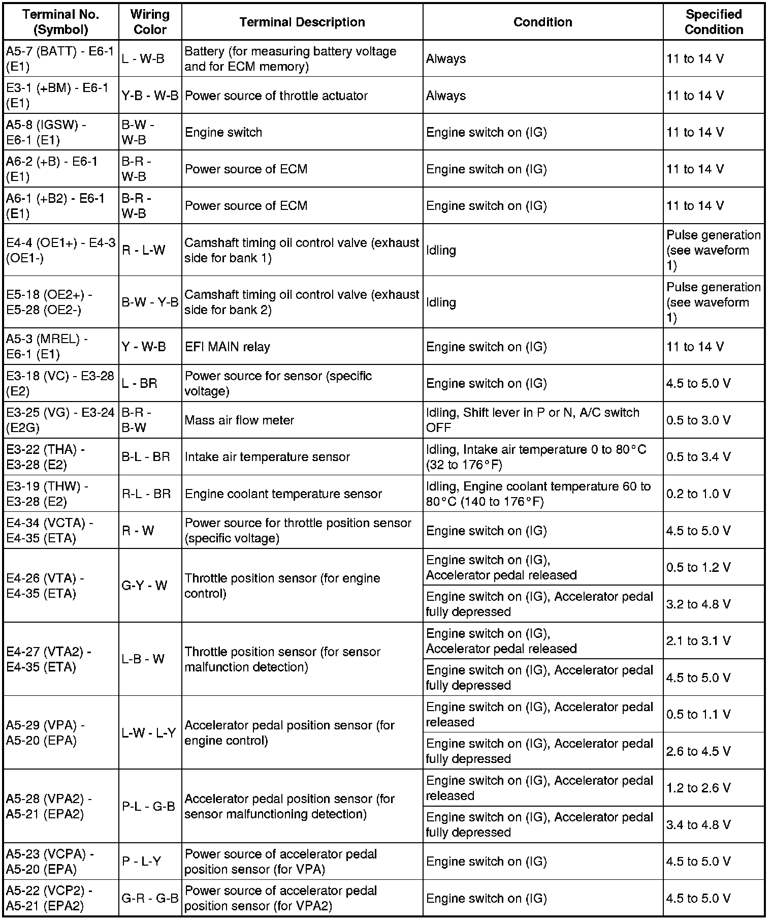 The standard normal voltage between each pair of the ECM terminals is shown in the table below. The appropriate conditions for checking each pair of the terminals are also indicated. The result of checks should be compared with the standard normal voltage for that pair of terminals, displayed in the Specified Condition column. The illustration above can be used as a reference to identify the ECM terminal locations.