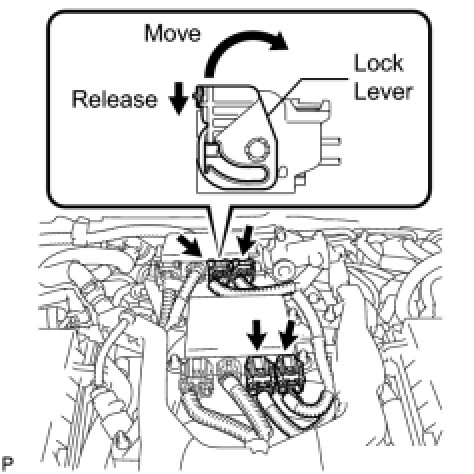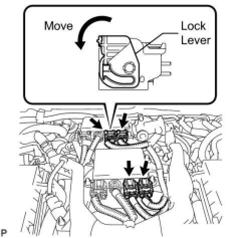 (5) Disconnect the 4 connectors with wire harness locks from the 2 injector drivers.