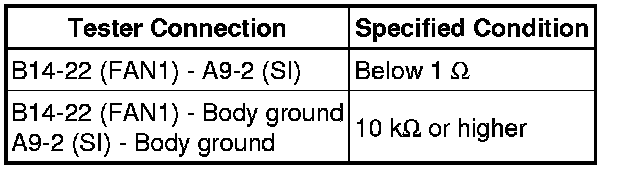 (c) Check the resistance of the wire harness between the front controller B14-22 (FAN1) and cooling fan ECU A9-2 (SI).