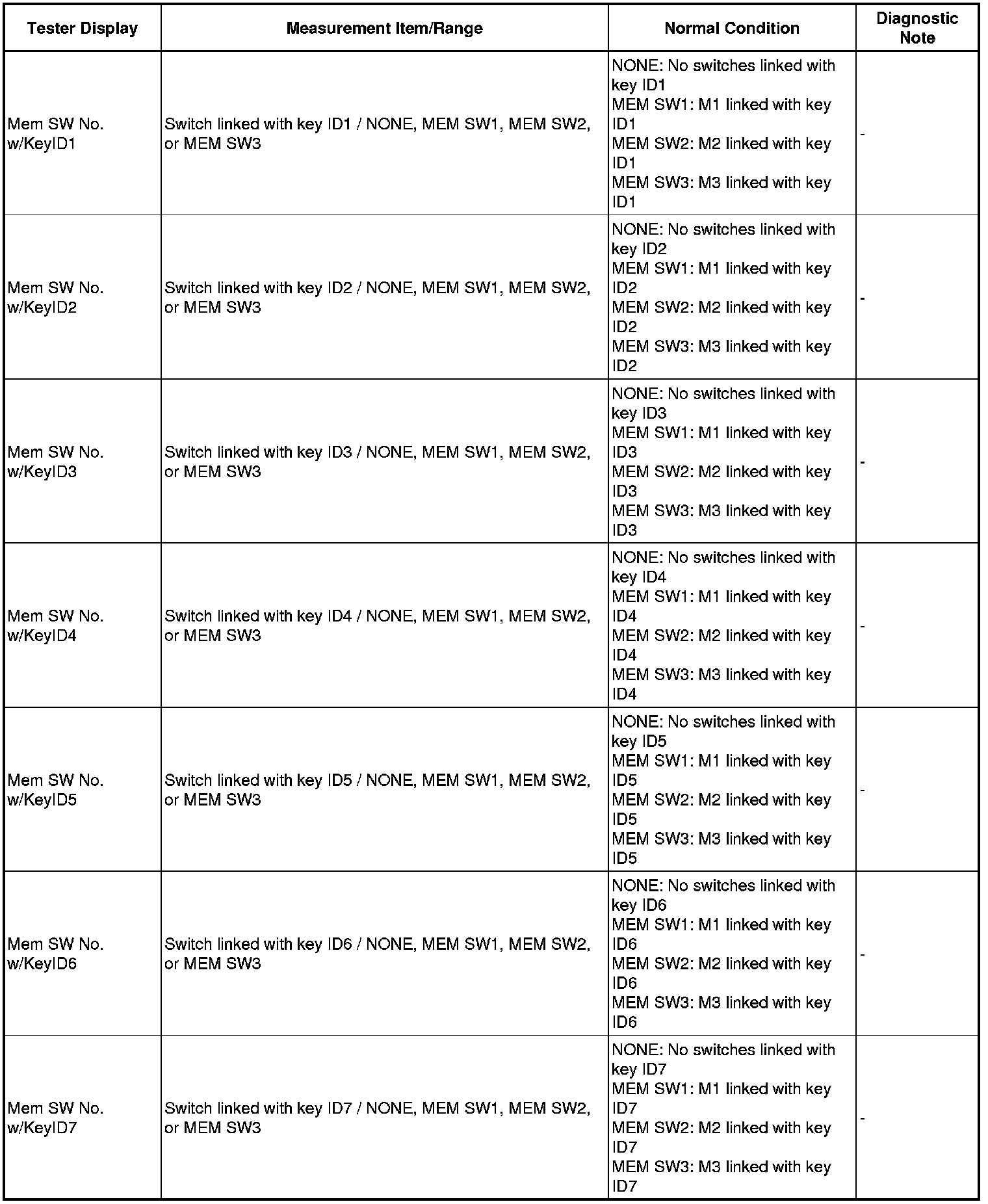 The key ID can be registered to be linked with each of the M1, M2 and M3 seat memory switches. The key ID registration procedure should be performed while the electrical key transmitter is in the vehicle, the engine switch is on (IG), and the driver door is closed. When the registration is completed, the buzzer will sound as an answer back.