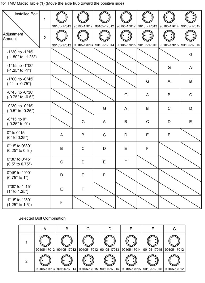 Check the combination of installed bolts. Select appropriate bolts from the table below to adjust the camber to the specified values.