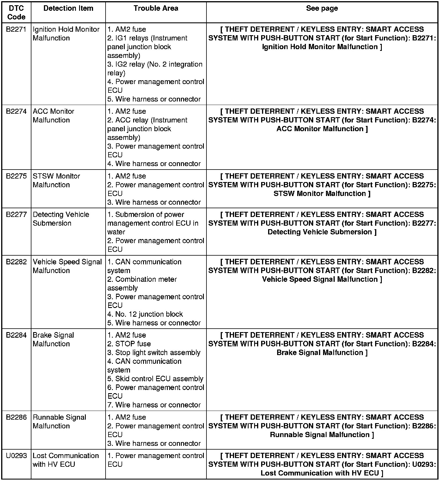 Home >> Lexus >> 2012 >> CT 200h L4-1.8L (2ZR-FXE) Hybrid >> Repair and Diagnosis >> A L L Diagnostic Trouble Codes ( DTC ) >> Testing and Inspection >> Diagnostic Trouble Code Descriptions >> Smart Access System With Push-Button Start (For Start Function)
