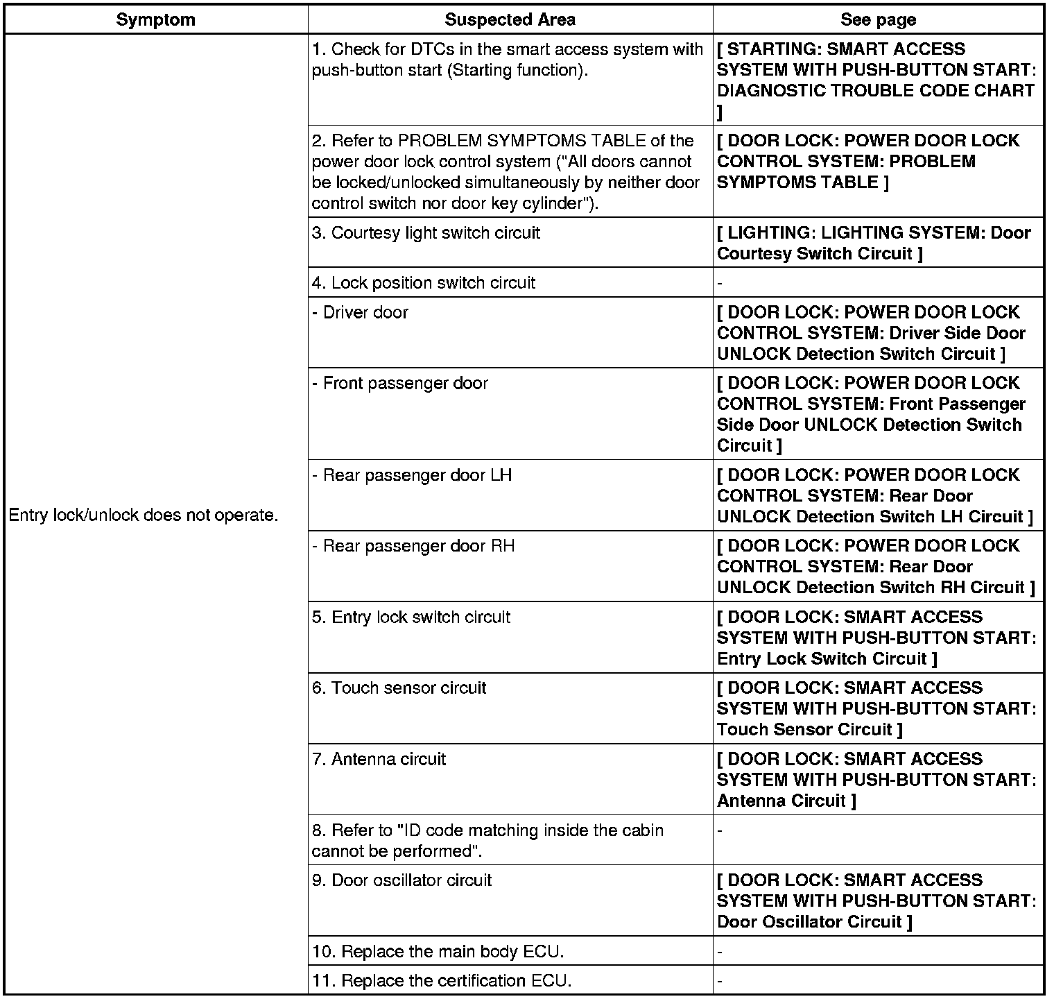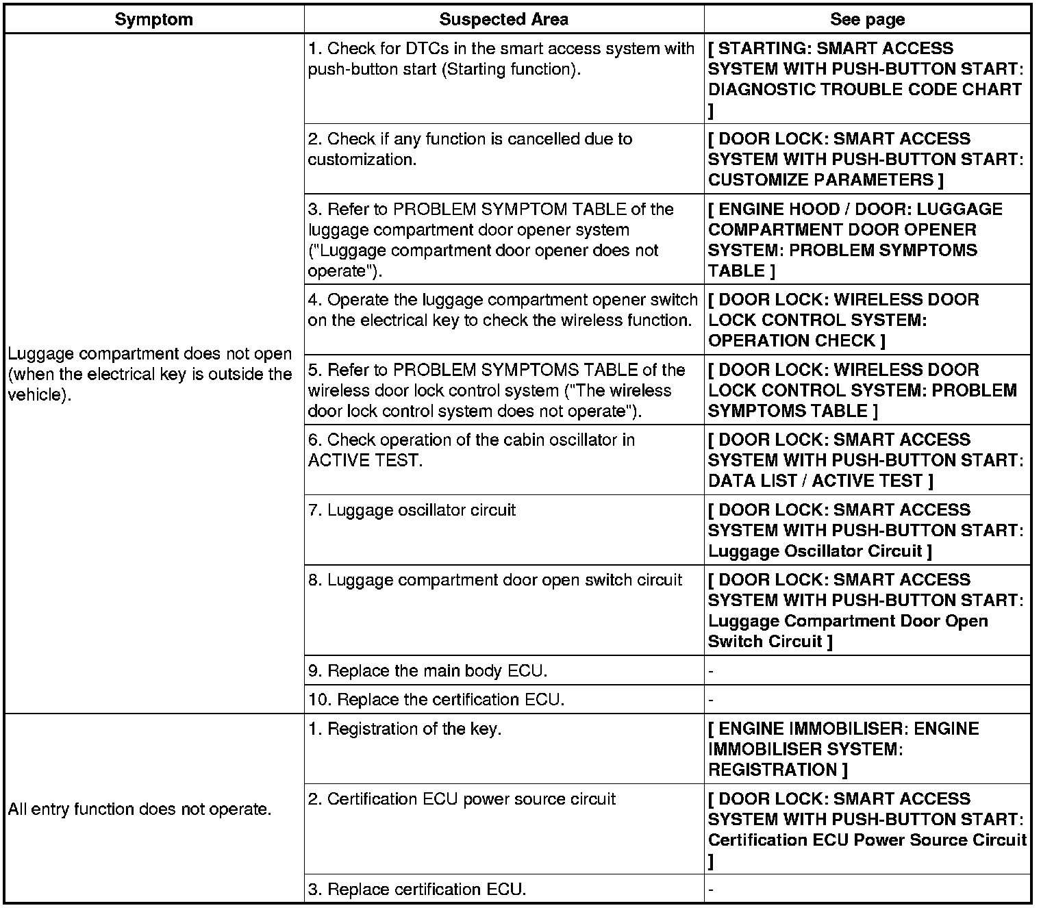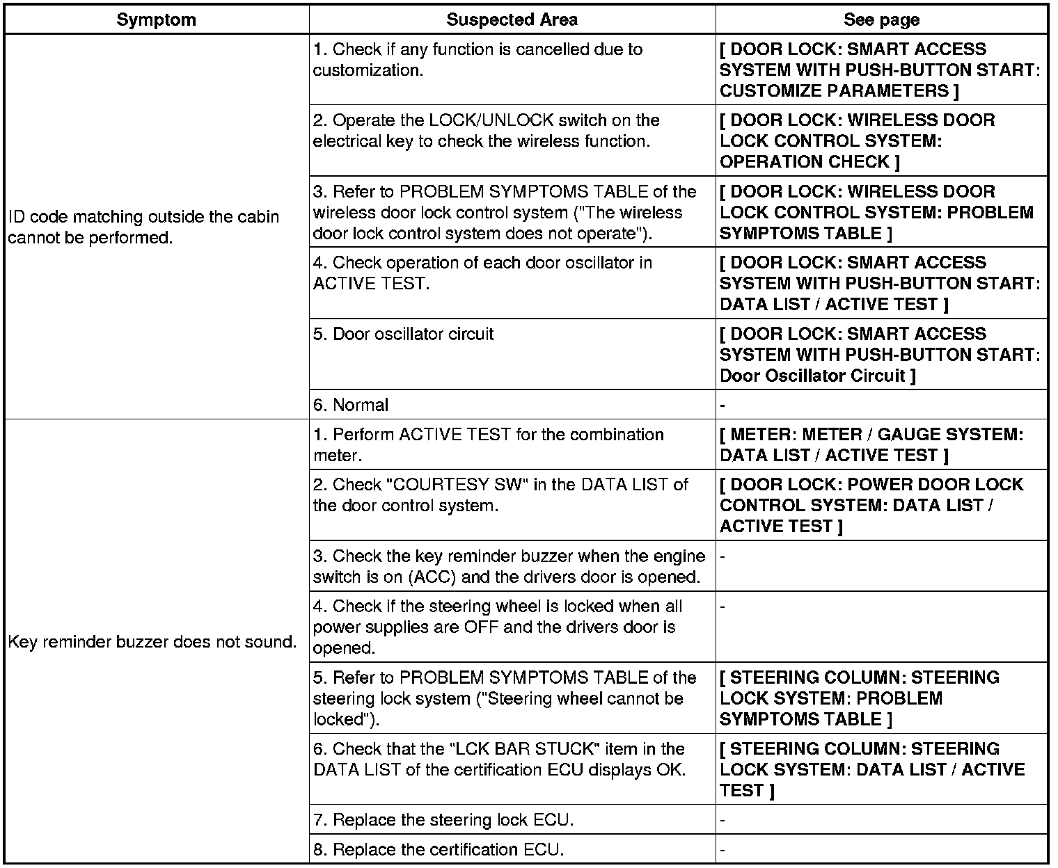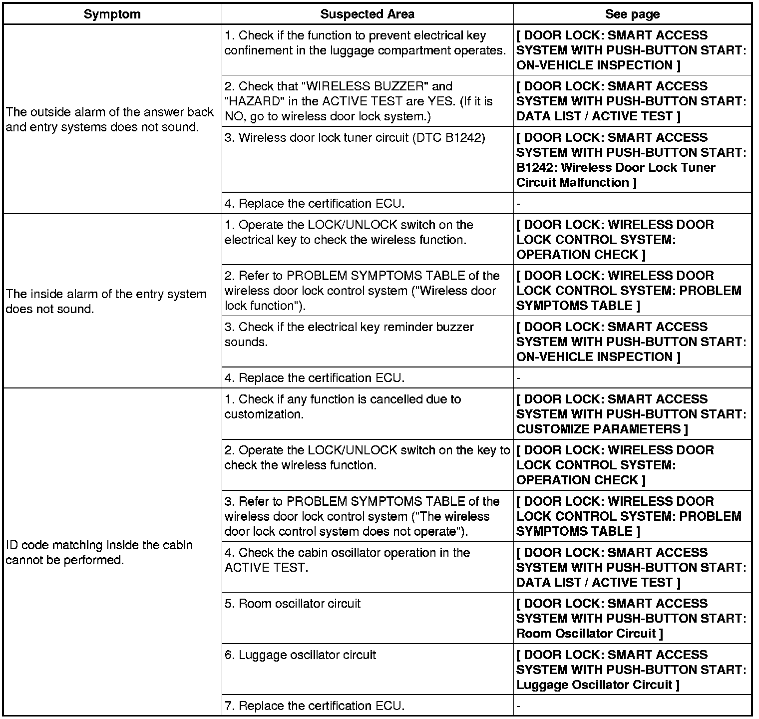 DOOR LOCK: SMART ACCESS SYSTEM WITH PUSH-BUTTON START: PROBLEM SYMPTOMS TABLE