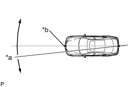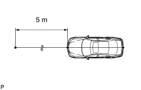 (2) Set one end of the 10 m (32.82 ft.) string on the vehicle's rear center point. Run the string over the vehicle's front center point to a position 5 m (16.41 ft.) beyond the vehicle's front center point, as shown in the illustration. Mark the 5 m (16.41 ft.) position.