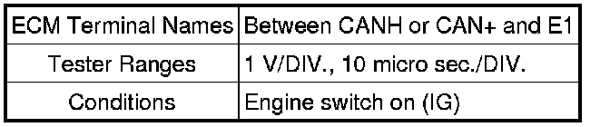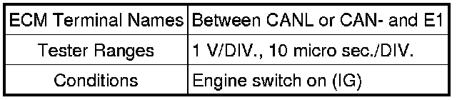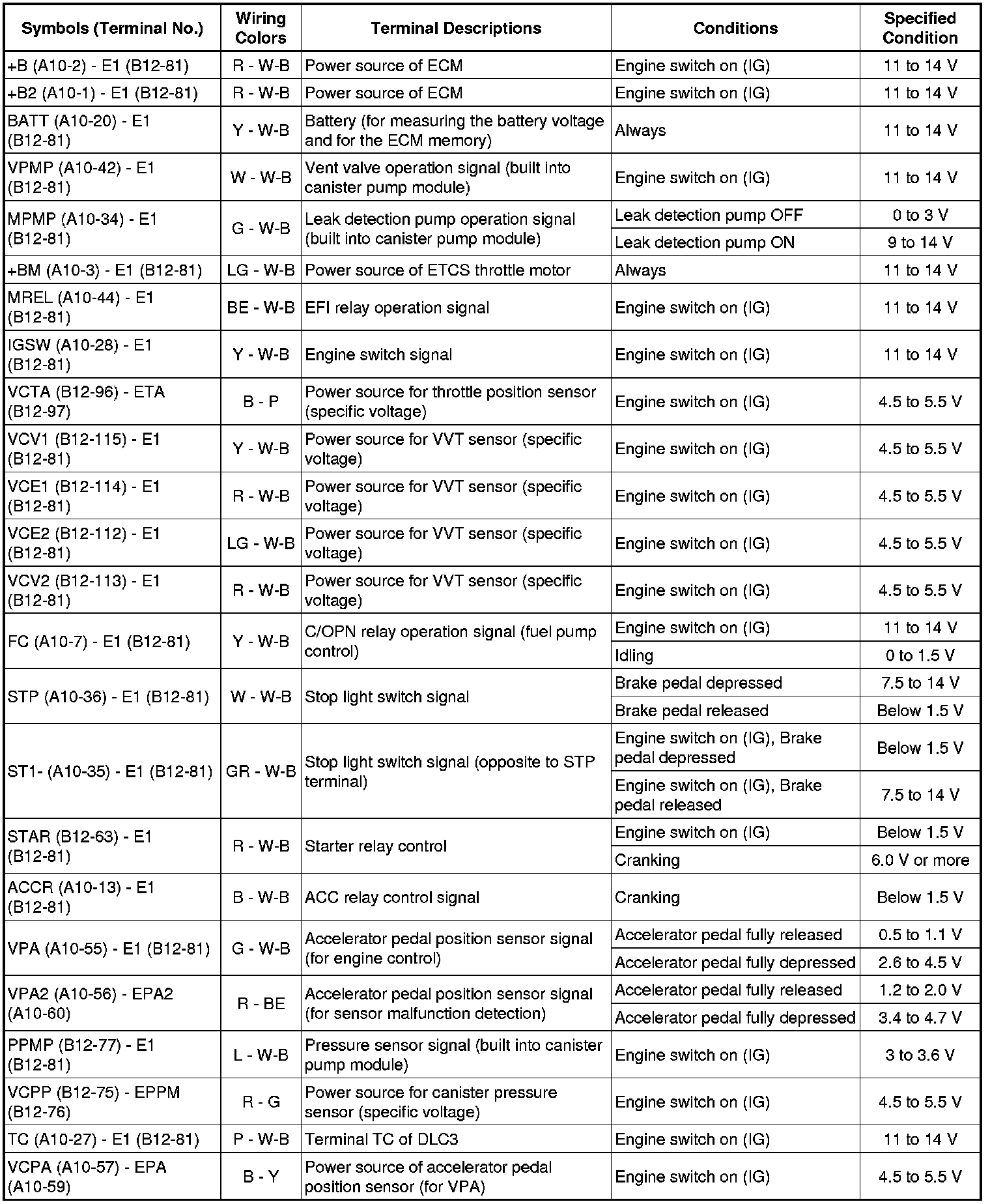 The standard normal voltage between each pair of the ECM terminals is shown in the table below. The appropriate conditions for checking each pair of the terminals are also indicated.