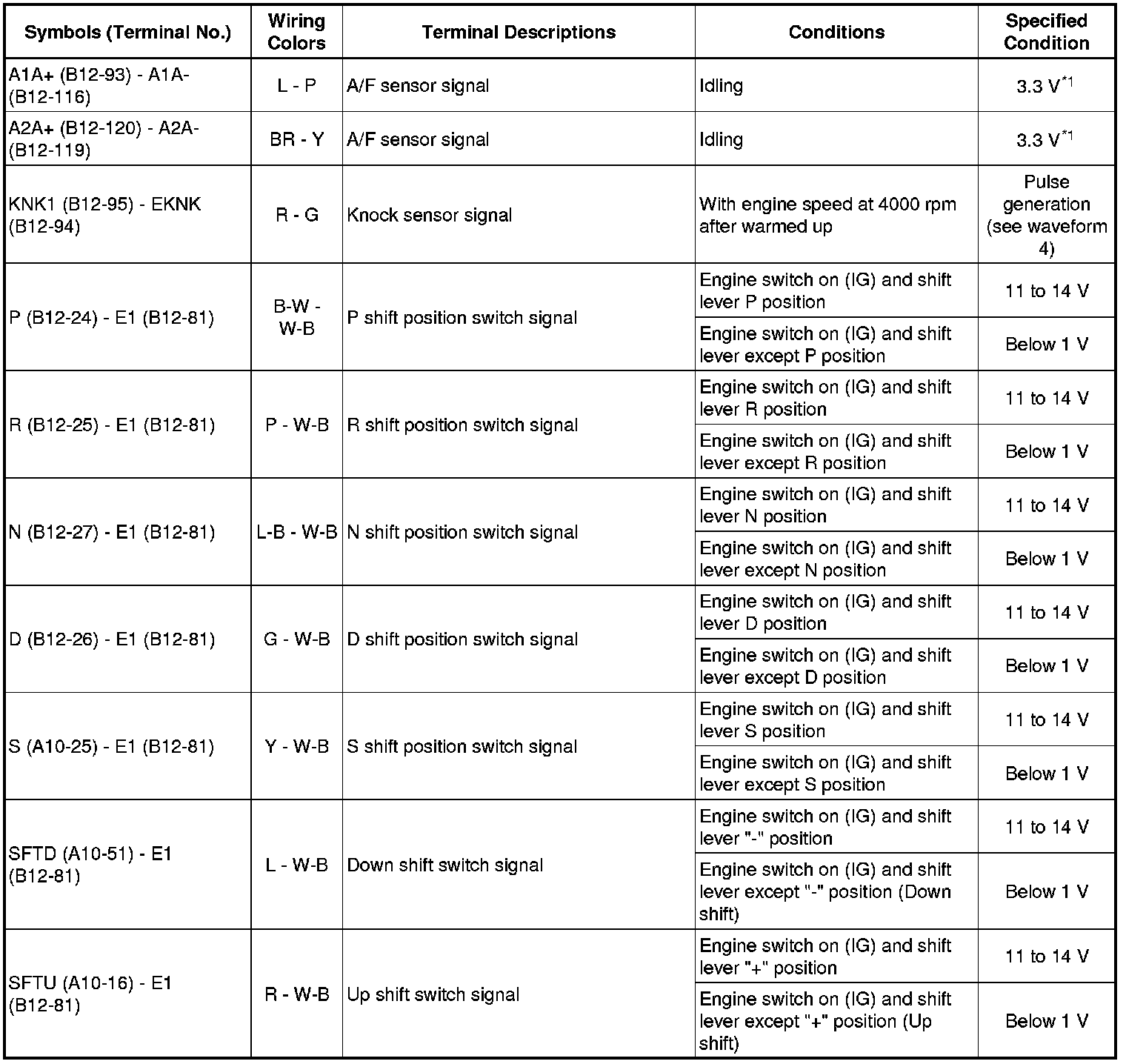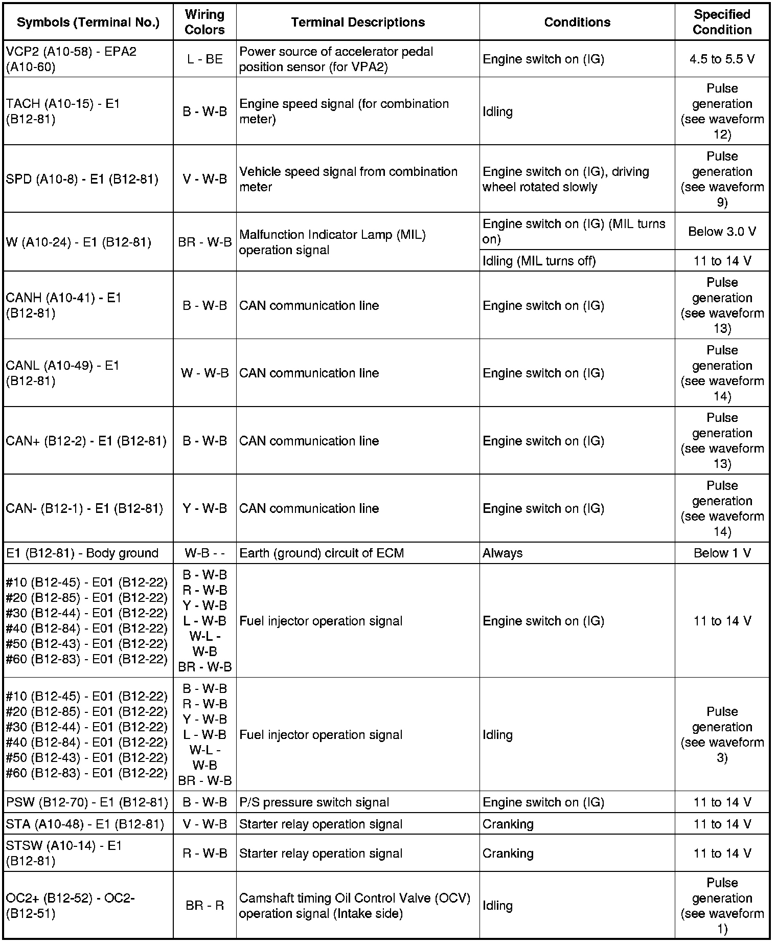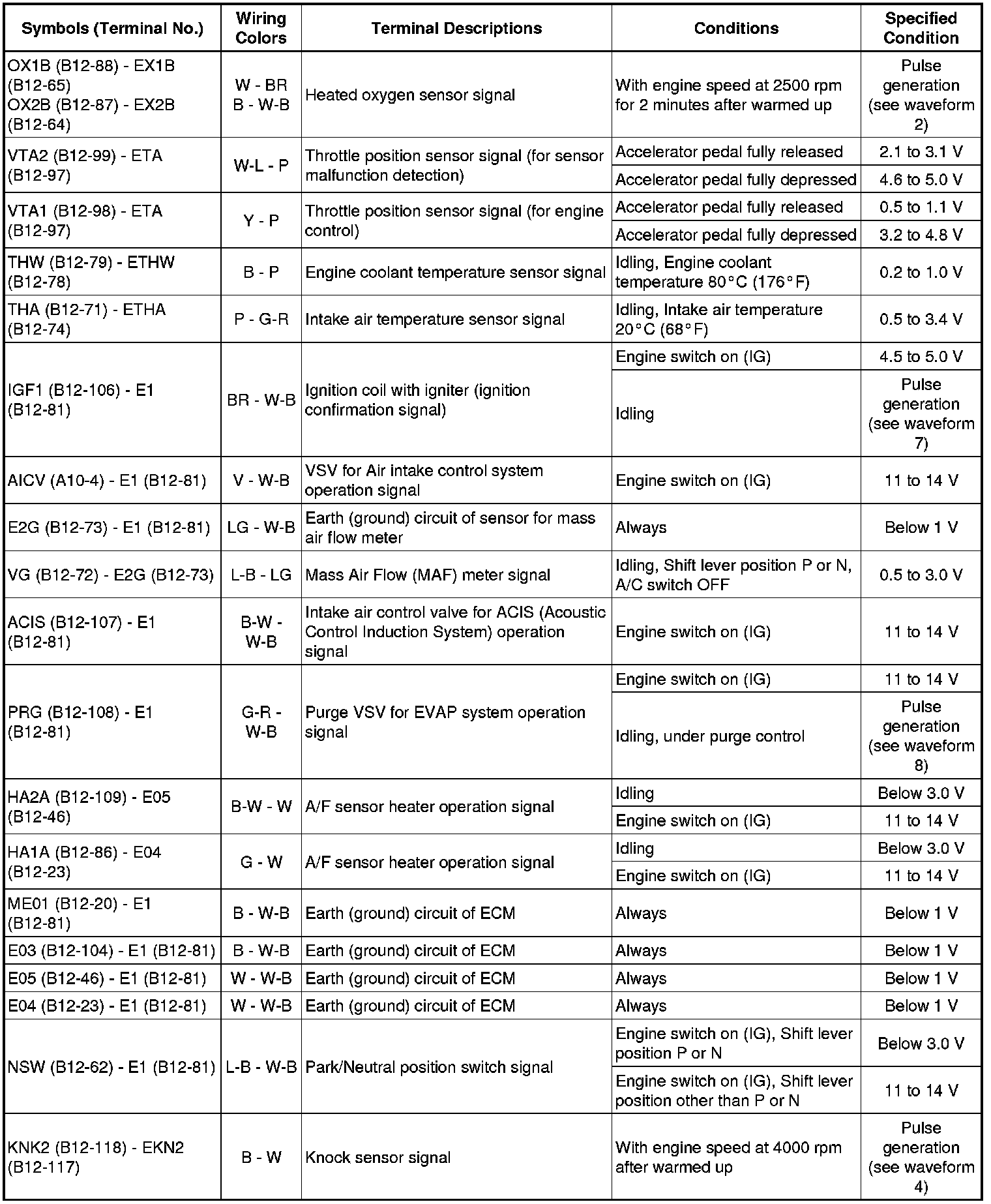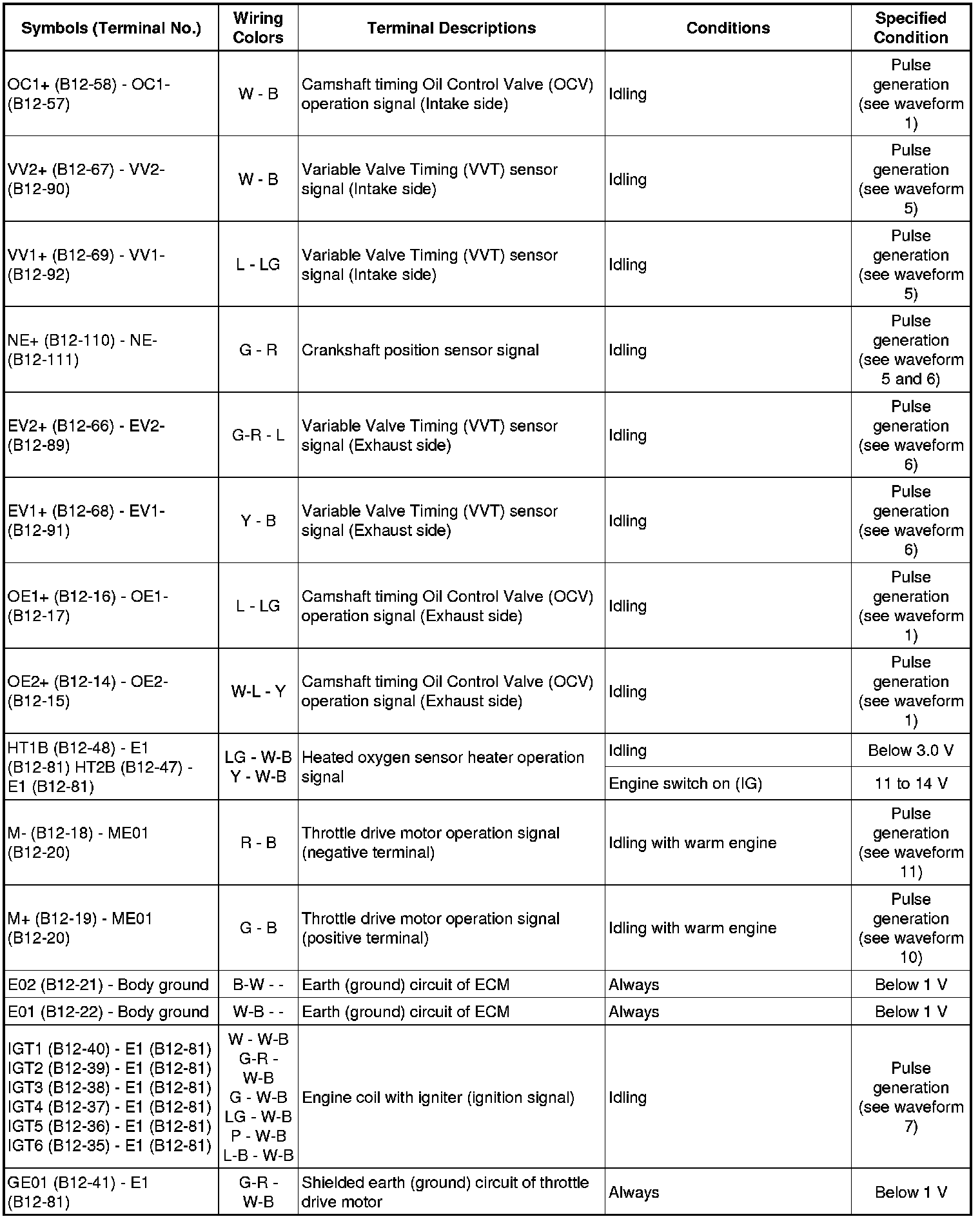 Home >> Lexus >> 2012 >> ES 350 V6-3.5L (2GR-FE) >> Repair and Diagnosis >> Powertrain Management >> Computers and Control Systems >> Engine Control Module >> Testing and Inspection >> Pinout Values and Diagnostic Parameters