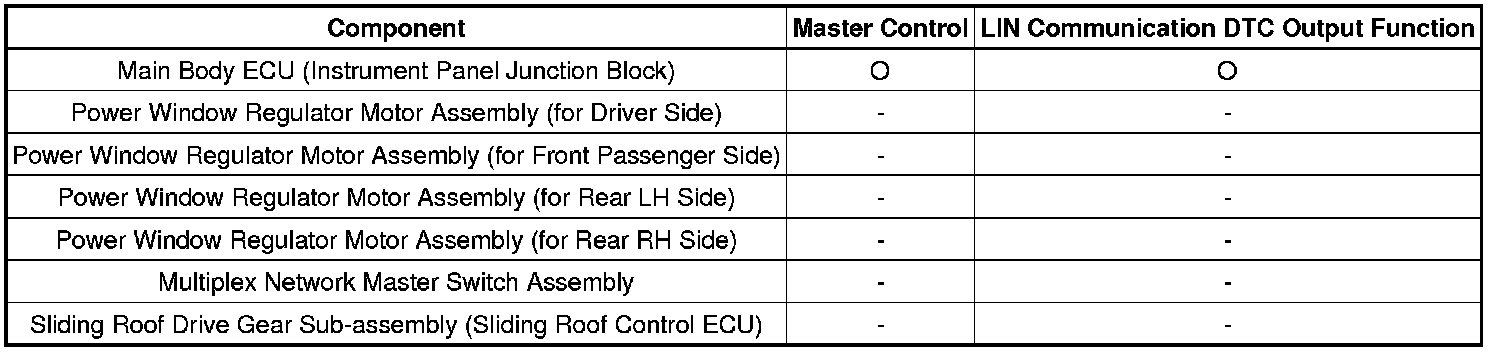 The LIN communication system is used for communication between the components in the table below. If communication cannot be performed through LIN communication because of an open in the communication lines or other reason, the master control ECU of the relevant system will output a DTC. Refer to the table below about the communication bus lines and connected components.