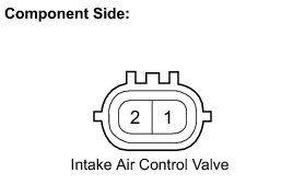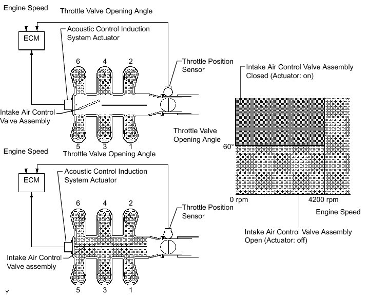 When the engine speed is between 0 and 4200 rpm and the throttle valve opening angle is 60° or more, the ECM supplies current to the actuator (on status), to close the intake air control valve assembly. Under other conditions, the intake air control valve assembly is open.