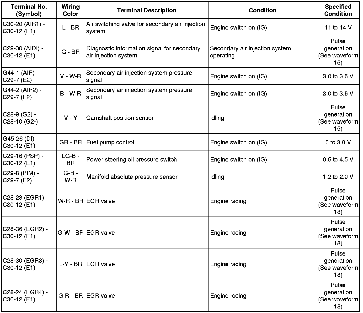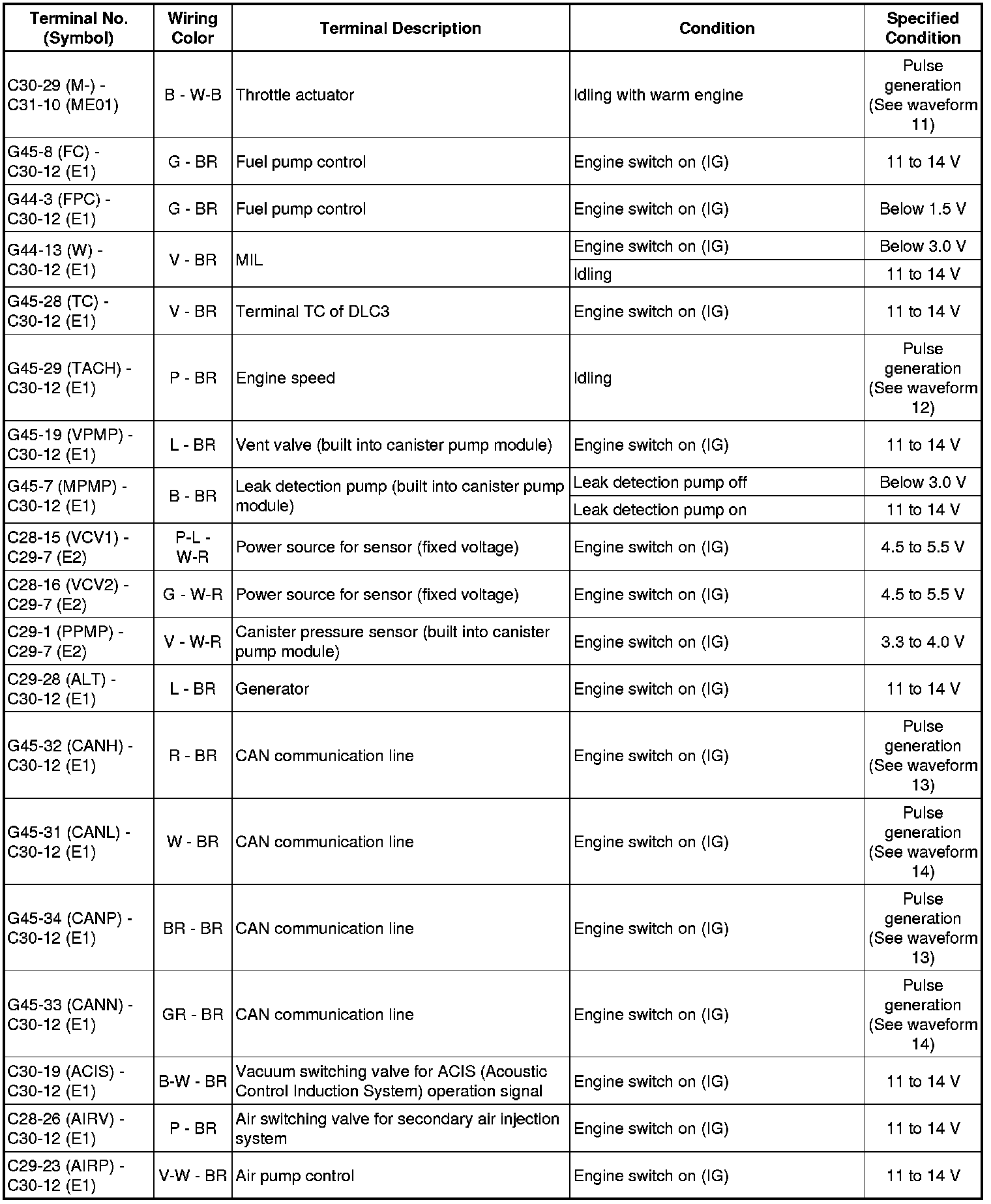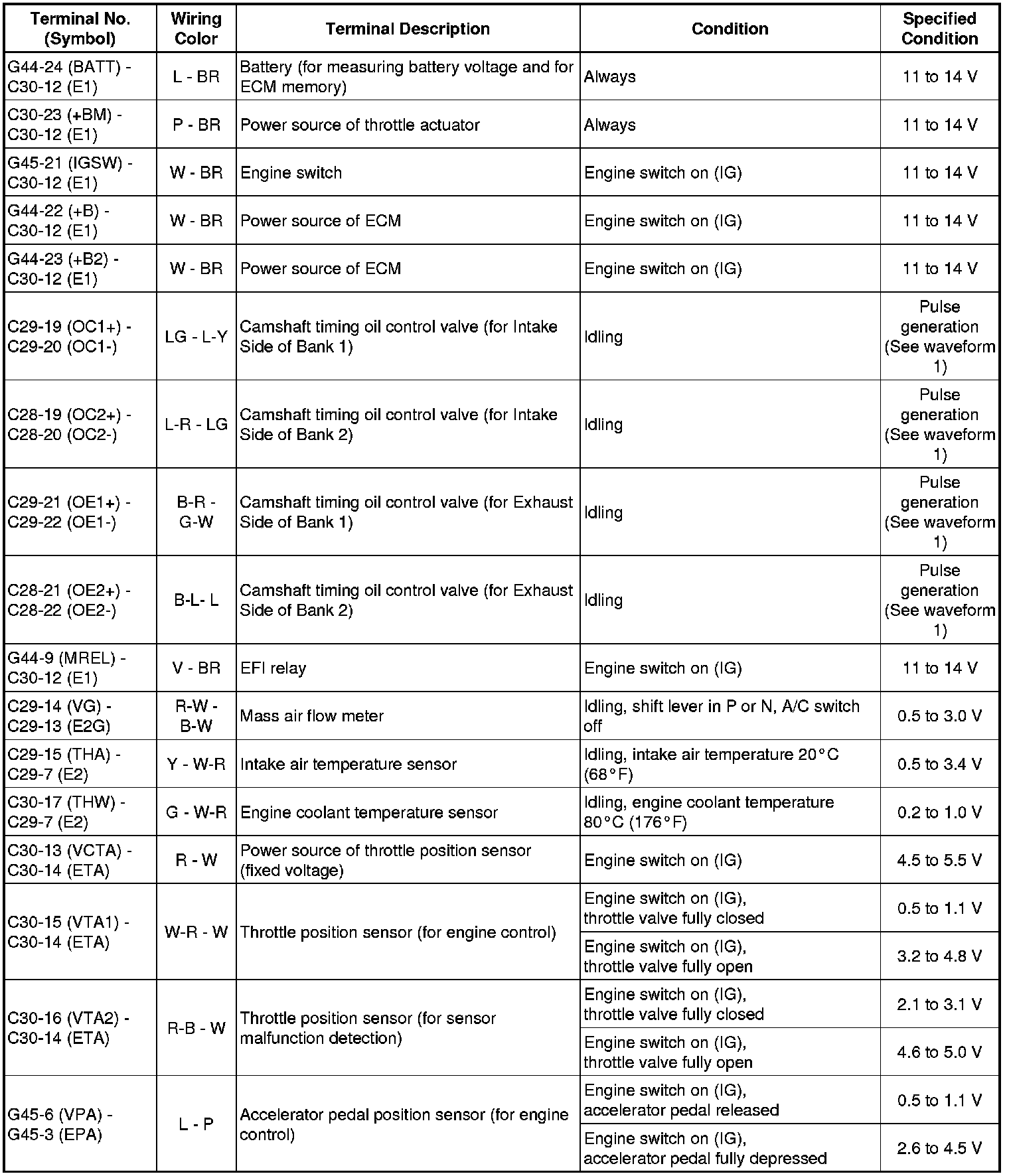 The standard voltage between each pair of ECM terminals is shown in the table below. The appropriate conditions for checking each pair of terminals are also indicated. The result of checks should be compared with the standard voltage for that pair of terminals, displayed in the "Specified Condition" column. The illustration above can be used as a reference to identify the ECM terminal locations.