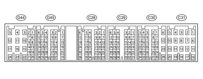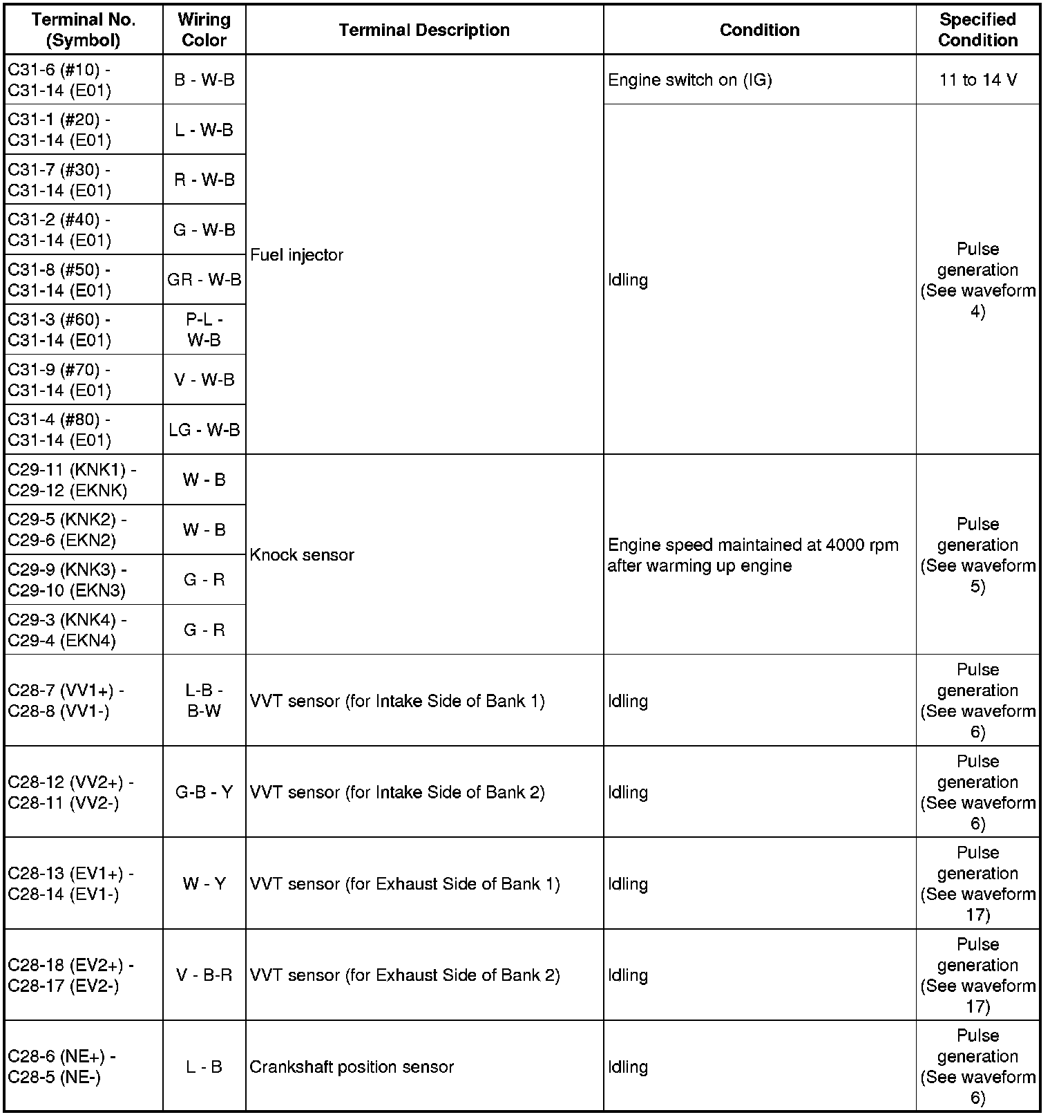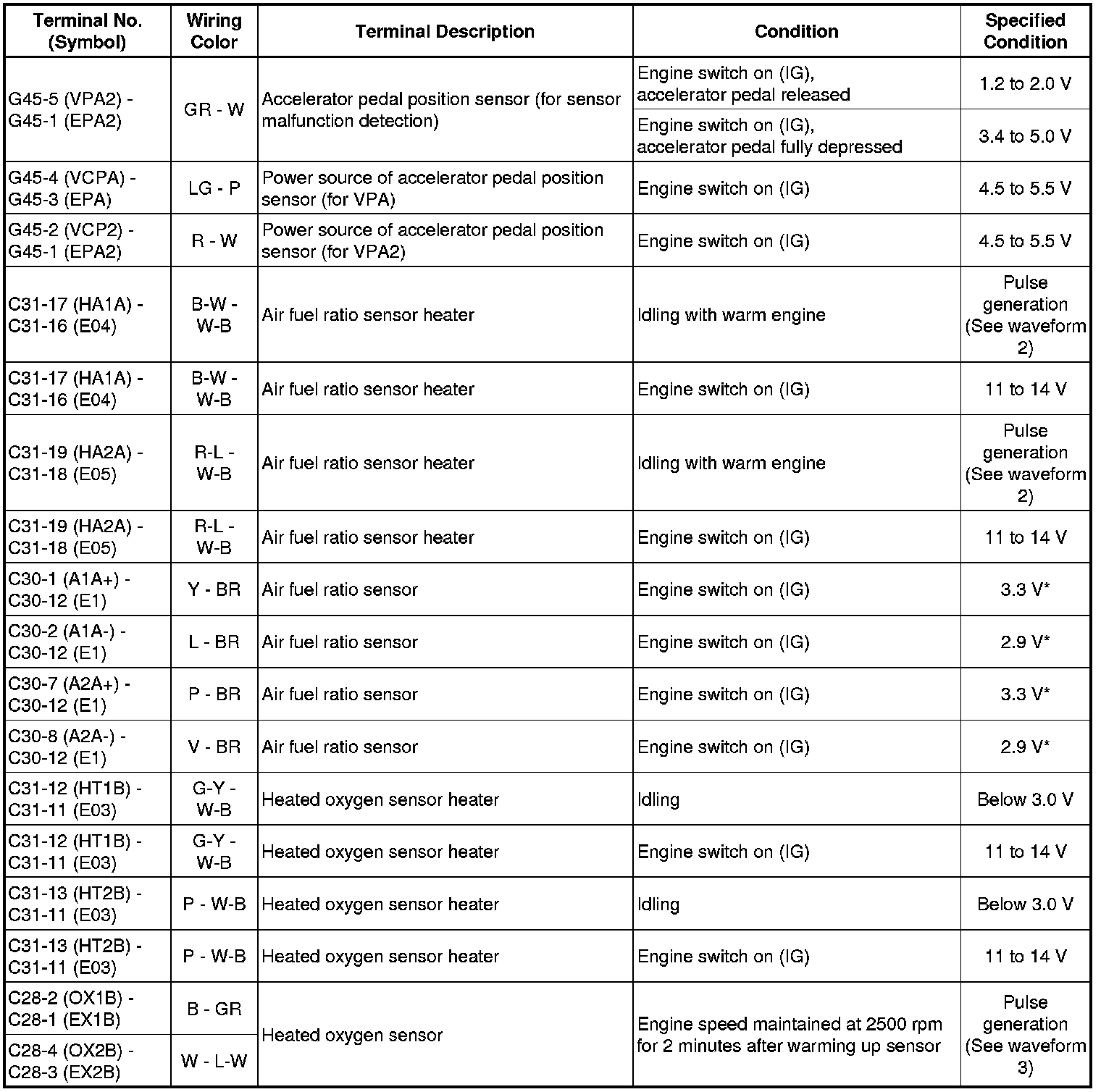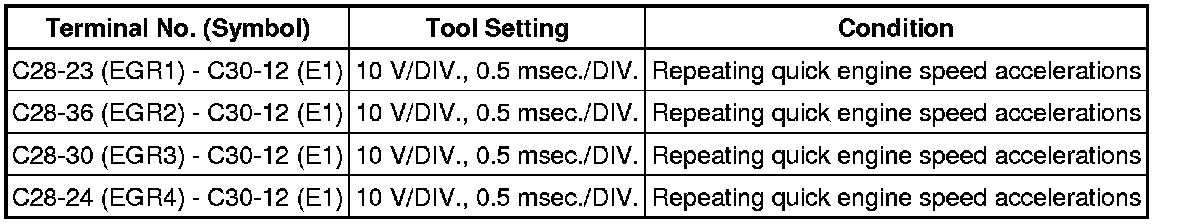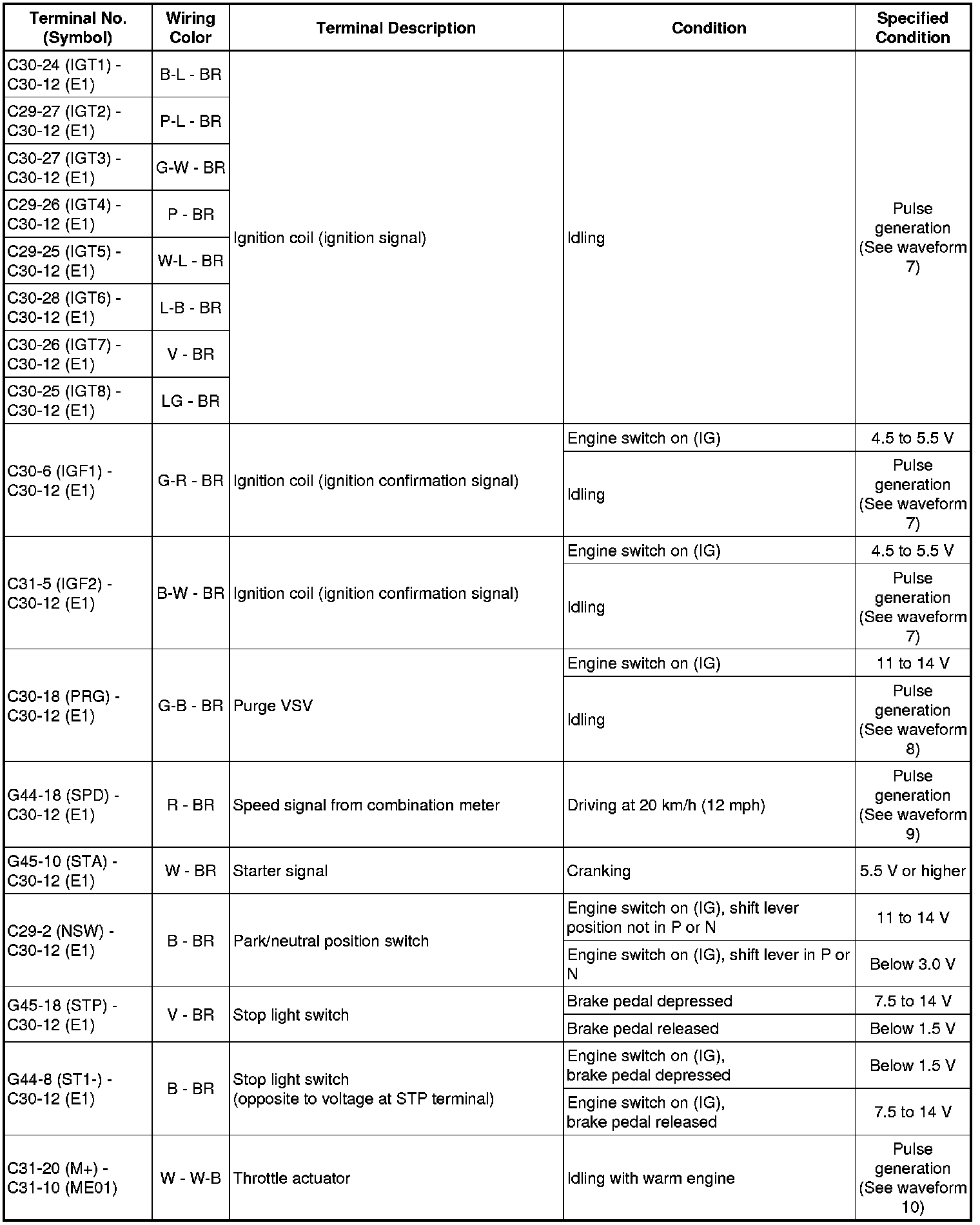 The standard voltage between each pair of ECM terminals is shown in the table below. The appropriate conditions for checking each pair of terminals are also indicated. The result of checks should be compared with the standard voltage for that pair of terminals, displayed in the "Specified Condition" column. The illustration above can be used as a reference to identify the ECM terminal locations.