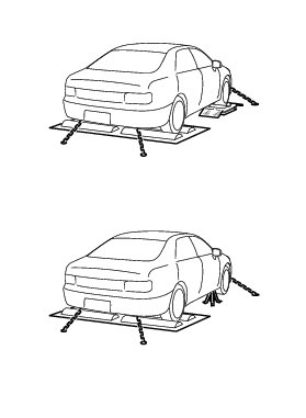 (2) Support the vehicle with safety stands at an appropriate height. Make sure that vehicle does not lean in any direction, and that the tires are completely clear of the floor.