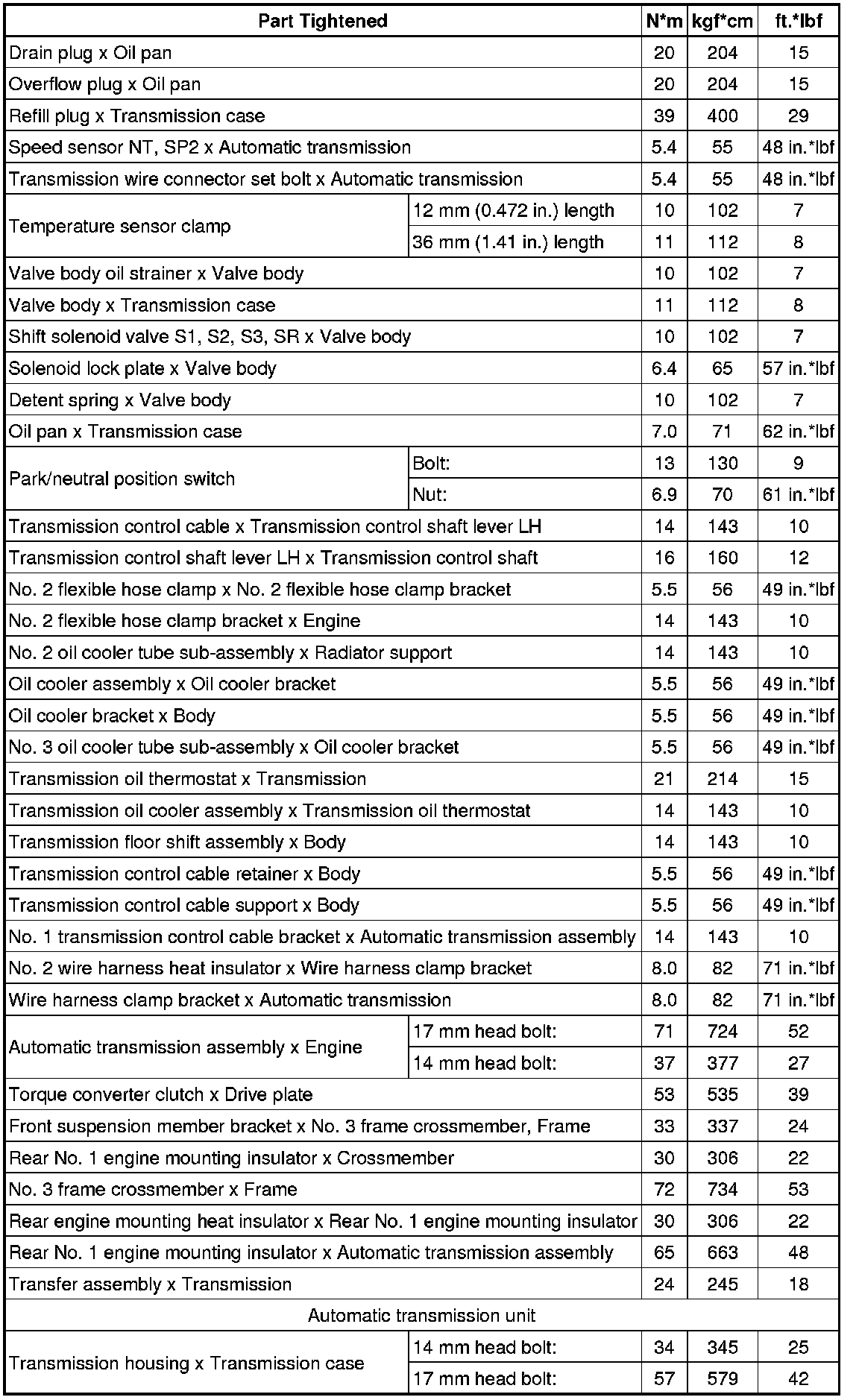 SPECIFICATIONS: A760F AUTOMATIC TRANSMISSION / TRANSAXLE: TORQUE SPECIFICATIONS