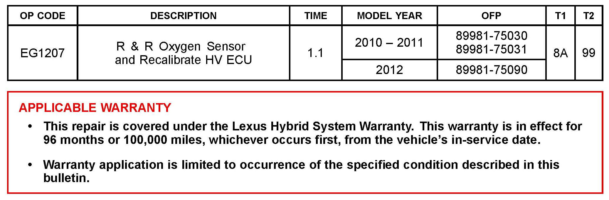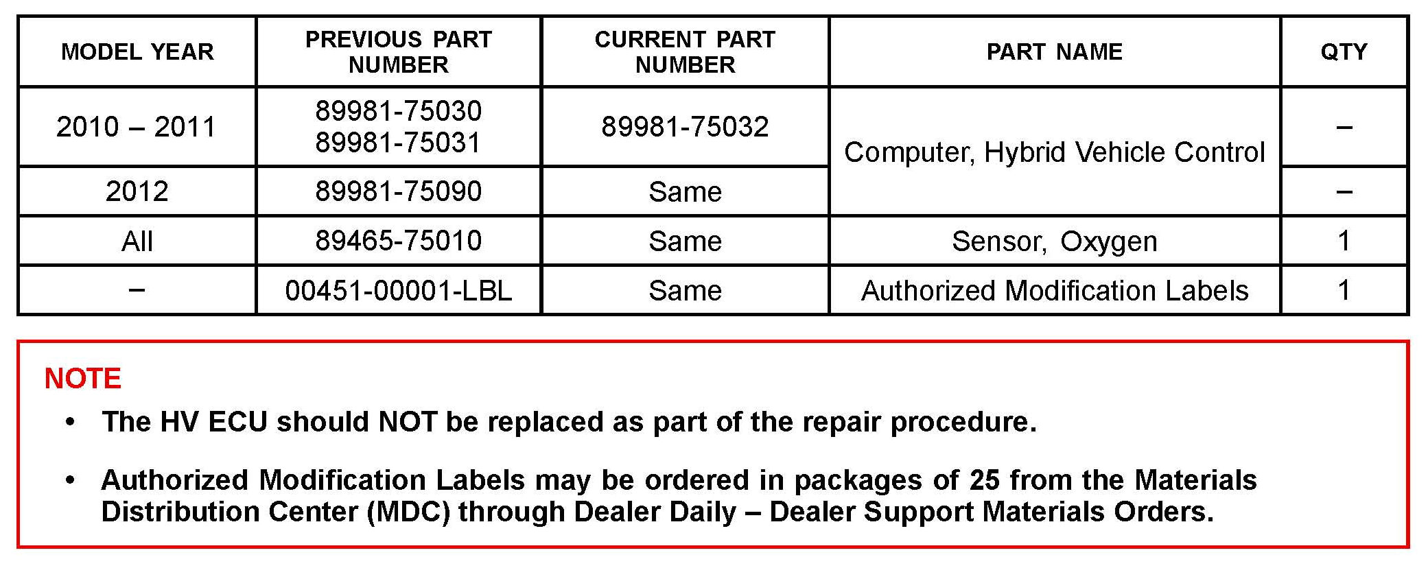 Some 2010 - 2012 model year HS 250h vehicles equipped with a 2AZ-FXE engine may exhibit a MIL "ON" condition with Diagnostic Trouble Code (DTC) P0136 - Oxygen Sensor Circuit Malfunction (Bank 1 Sensor 2). The oxygen sensor and Hybrid Vehicle ECU (HV ECU) logic have been modified to reduce the possibility of this condition occurring. Use the following repair procedure to address this condition.