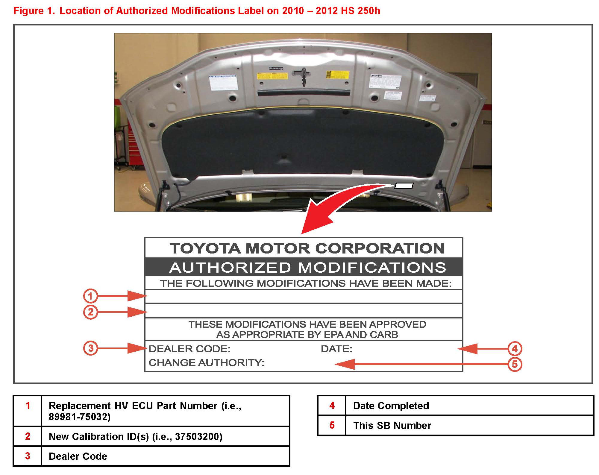 3. Check for the Authorized Modi.cations Label affixed to the vehicle in the location shown in Figure 1. Confirm if the HV ECU calibration has been updated. If the calibration ID listed is NOT the latest HV ECU calibration - go to step 4.