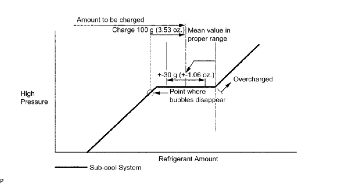 * Approximately 100 g (3.53 oz.) of refrigerant may need to be charged after bubbles disappear. The refrigerant amount should be checked by measuring its quantity, and not with the sight glass.
